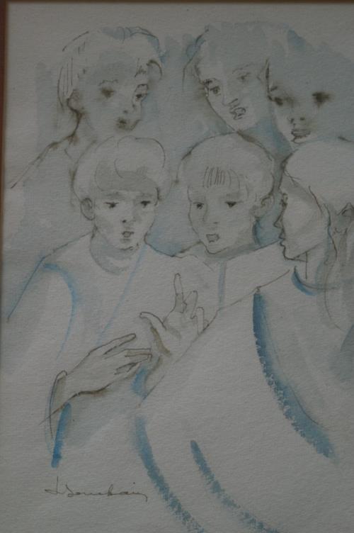 1 aquarelle et crayon de P. Bouchain (né à Paris en 1916 France) " 6 garçons" sbg. H.31x24 cm.