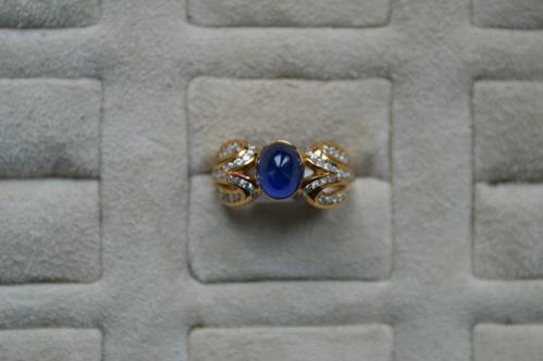 1 *bague en or jaune .750 avec un saphir cabochon ovale de Ceylan et diamants.