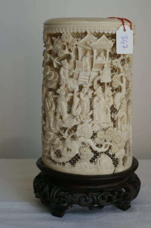 1 bitong ou porte-pinceau en ivoire de Canton ajouré à décor de chasseurs dans la campagne sur un fond de treillis. H. 16.2 cm. D. 9.8x8.9 cm. (Quelques fissures et gerces anciennes)