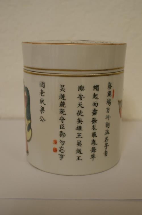 1 boîte en porcelaine de Chine à décor de personnages et calligraphies d'époque Daoguang XIX e s. H. 11.2 cm. D. 9.7 cm. (Couvercle recollé)