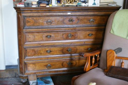 1 commode bureau de style Renaissance d'époque Nap. III à 4 tiroirs sur pieds raves et marqueterie géométrique sur la face. H. 103x110x59.5 cm.