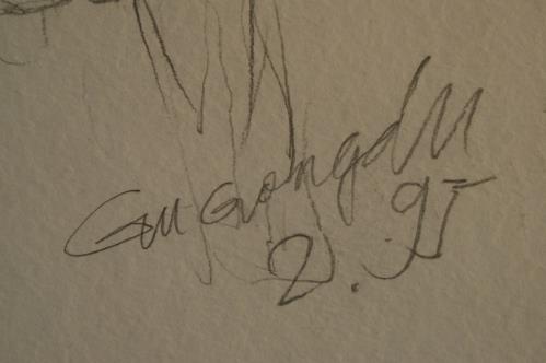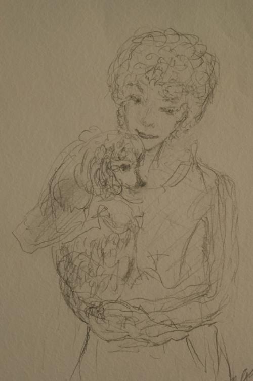 1 dessin au crayon de Gut G... XX e s. "Jeune femme au caniche" sbd. illisible 40x30 cm.