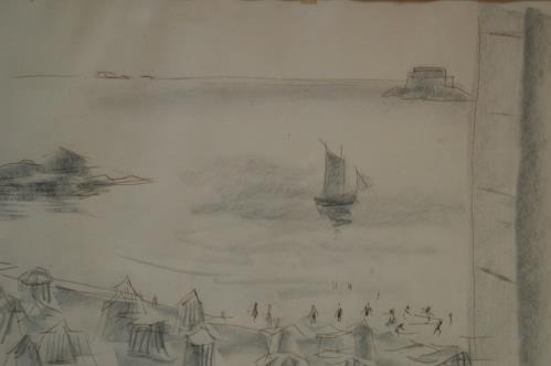 1 dessin à l'encre et à la mine de plomb de René Francillon (1878-1973) "Paysage - plage de St. Malo