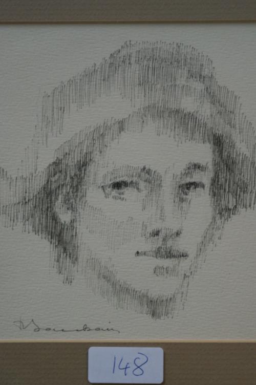 1 dessin à la plume sur papier de P. Bouchain (né à Paris en 1916 France) "Tête d'Arlequin" sbg. H. 15.2x15.2 cm.