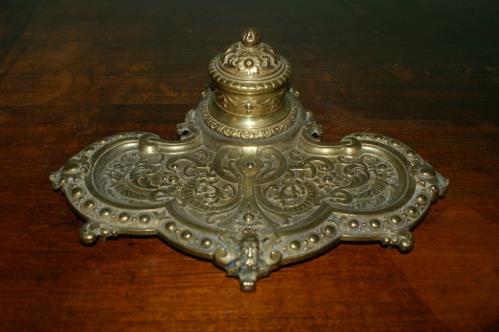 1 encrier en bronze d'époque Nap. III avec son récipient en verre. H. 7.5x24x19 cm. (porte le n° 649 au dos)