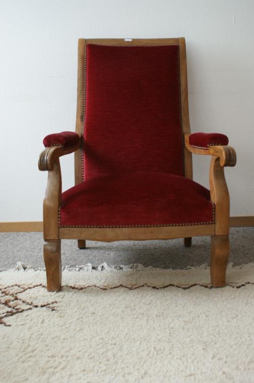 1 fauteuil Directoire à dossier plat en noyer recouvert de velours cramoisi. H. 105.5x67x71 cm.
