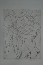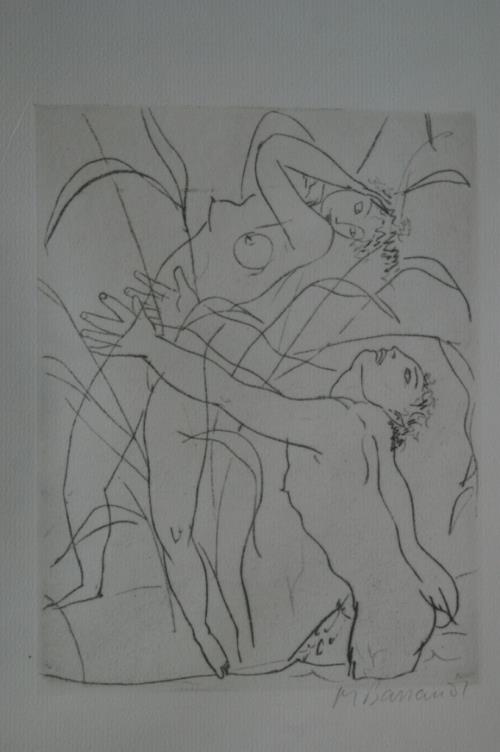 1 gravure sur cuivre de Maurice Barraud 1889-1955 "couple dans végétation" sbd au crayon M Barraud H. 21.8x16.8 cm. Tiré de l'après-midi d'un faune.