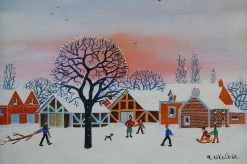 1 huile sur toile de R. Victoir "Le hameau sous la neige" sbd. 27x35 cm.