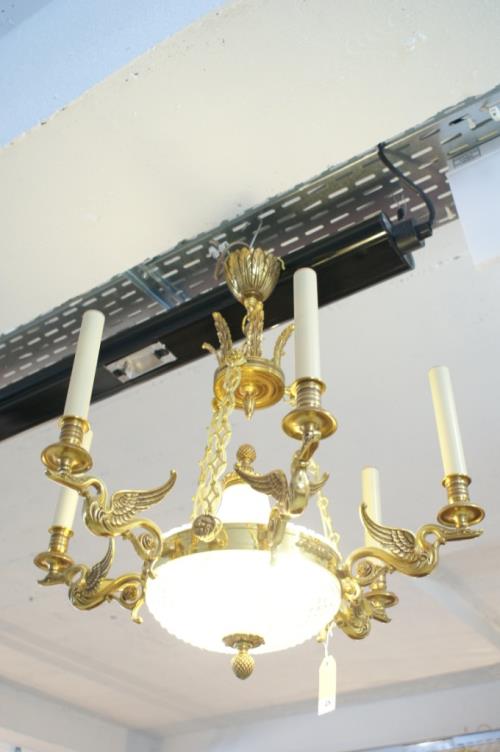 1 lustre en bronze doré de style Empire à 6 feux portés par des cygnes en vol et coupole centrale en