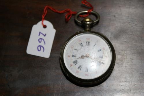 1 montre de poche avec chiffres des heures en ch. romain et minutes en chiffres arabes en rouge n° de la boîte 23308 D. 4 cm. (ne fonctionne pas)