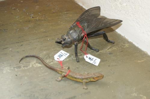 1 mouche en métal faisant office de récipient Verlag bei E. G Zimmermann in Hanau n° 12575 L. H. 5x11.8x7 cm. + 1 lézard en fonte peinte L. 14.1 cm.