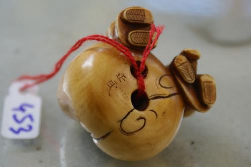 1 netsuke en noix de calao représentant Damoi et deux petits garçons, signé sous la base en deux caractères H. 3.5x4x4 cm.