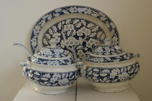 1 partie de service en faïence fine de Booths, à décor en bleu et blanc "Plumblossom" comprenant 2 soupières à couvercle H. 22.5 cm. L. aux anses 32.5 cm., 1 louche L. 32 cm. et un plat ovale H.4x46.8x37.5 cm ( petites fêlures sous la base et quelques ébréchures )