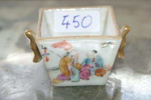 1 petit bol carré en porcelaine de Chine à deux anses H. 4.5x7.8x5.7 cm. à décor de personnages dans