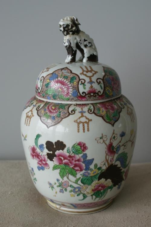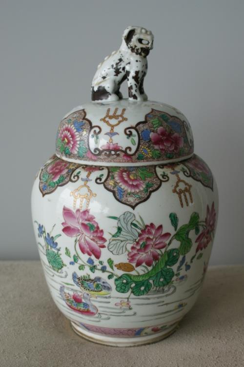 1 pot à gingembre à couvercle en porcelaine de Sanson du XIX e s. avec prise du couvercle en forme de Shishi, décor de fleurs et fleurs de lotus, col à frise de fleurs en médaillons H. 30 cm. D. 17.5 cm.