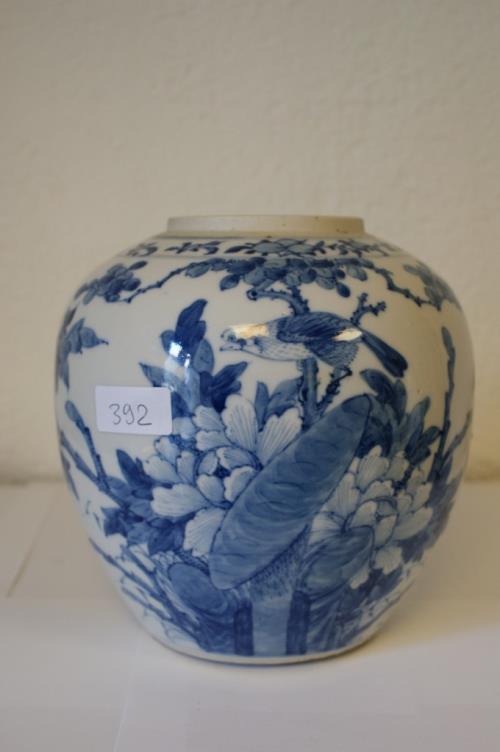 1 pot à gingembre à décor en bleu et blanc d'oiseau parmi des fleurs et papillons, bordure du col à
