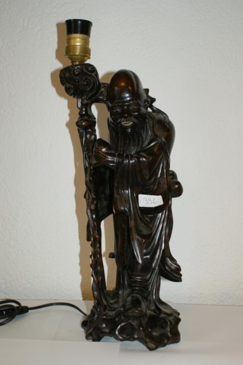 1 sculpture en bois sculpté d'un Shoulao dont le bâton est transformé en pied de lampe H. 39.5 cm.