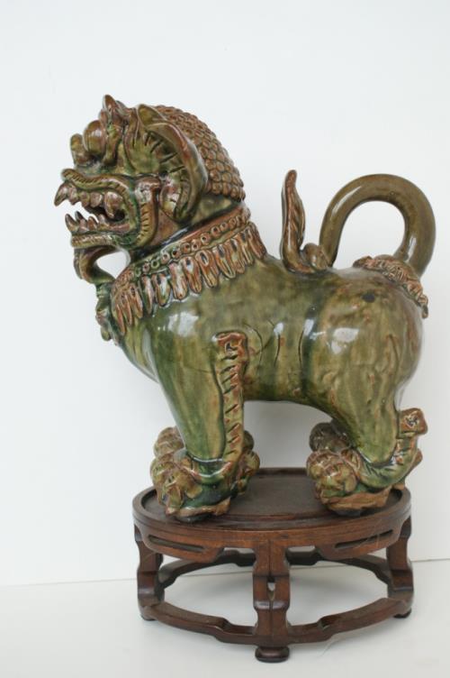 1 Shishi debout en terre cuite à glaçure verte de Chine du Sud ou Siam H. 29x19x27 cm. (sur un socle en bois)