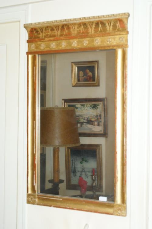 1 miroir d'époque Empire avec glace au mercure à cadre en bois doré et fronton à 9 rosaces et frise