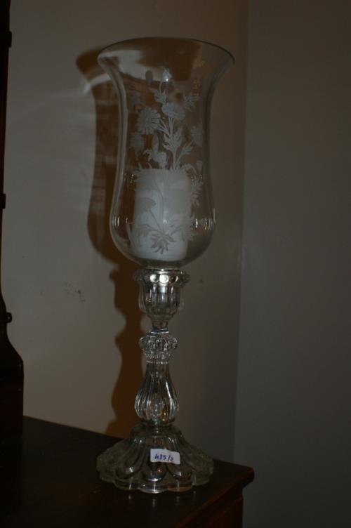 1 photophore en verre pressé (genre Baccarat) (avec ébréchures) H. 50 cm. D. 15.7 cm. on y joint un pied supplémentaire.