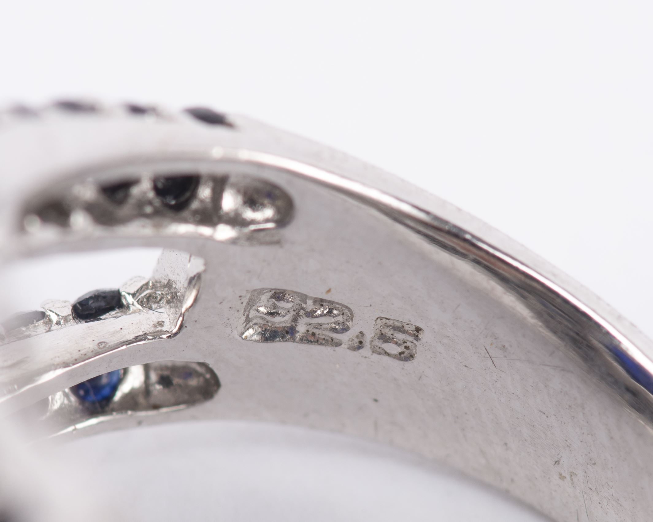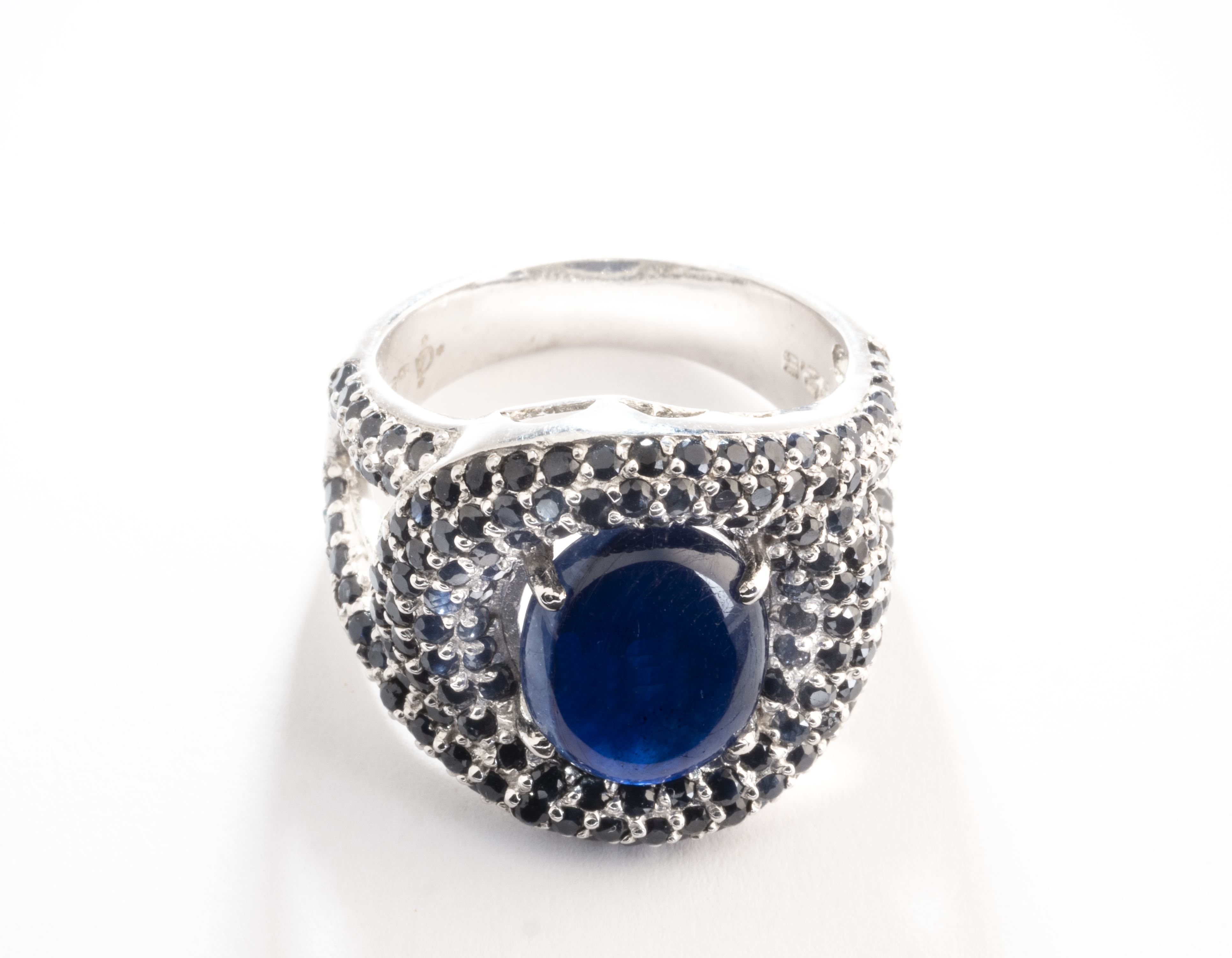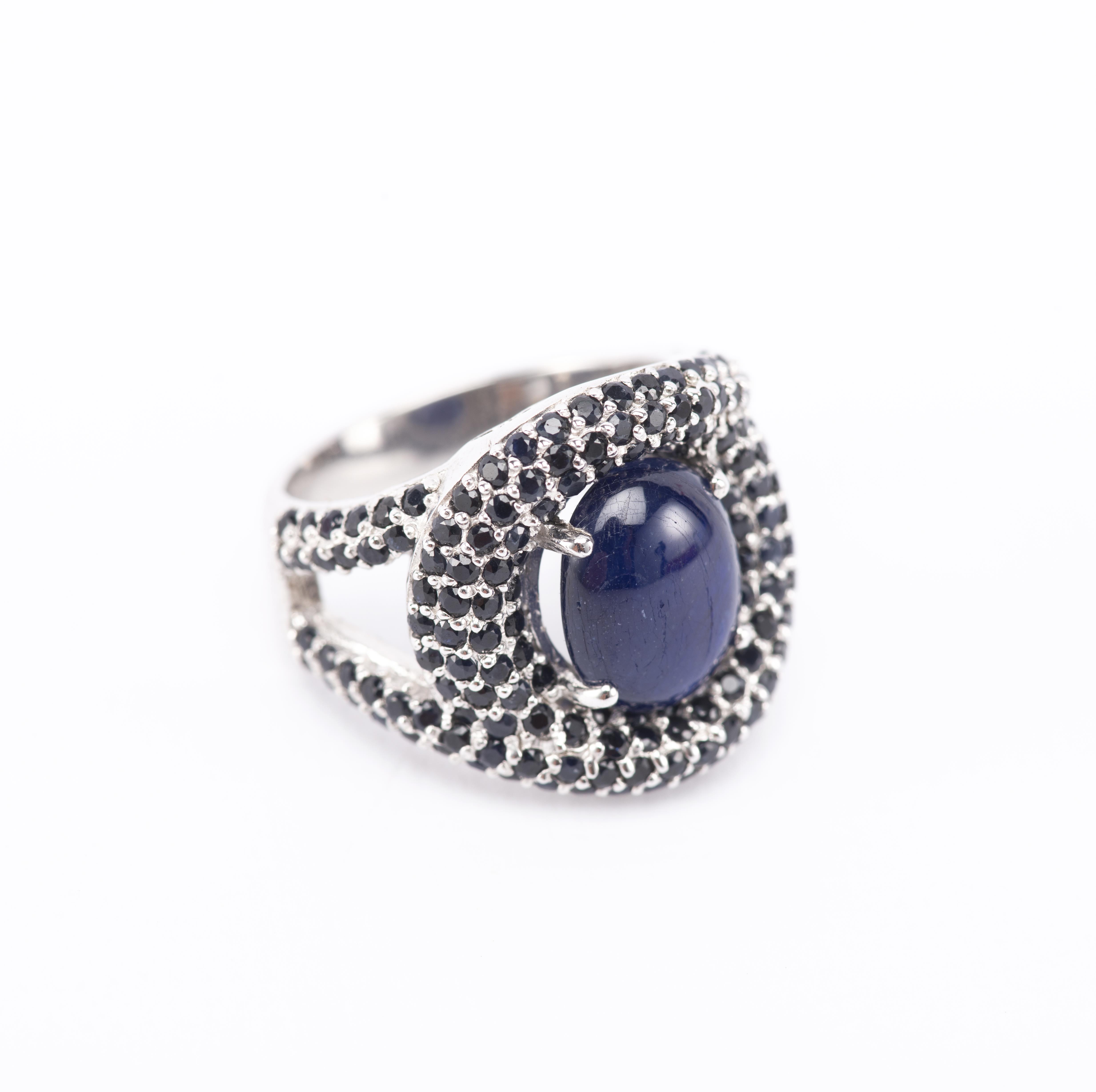 *Bague en argent .925 avec un saphir cabochon serti à griffes et un entourage de de spinelles noires.