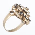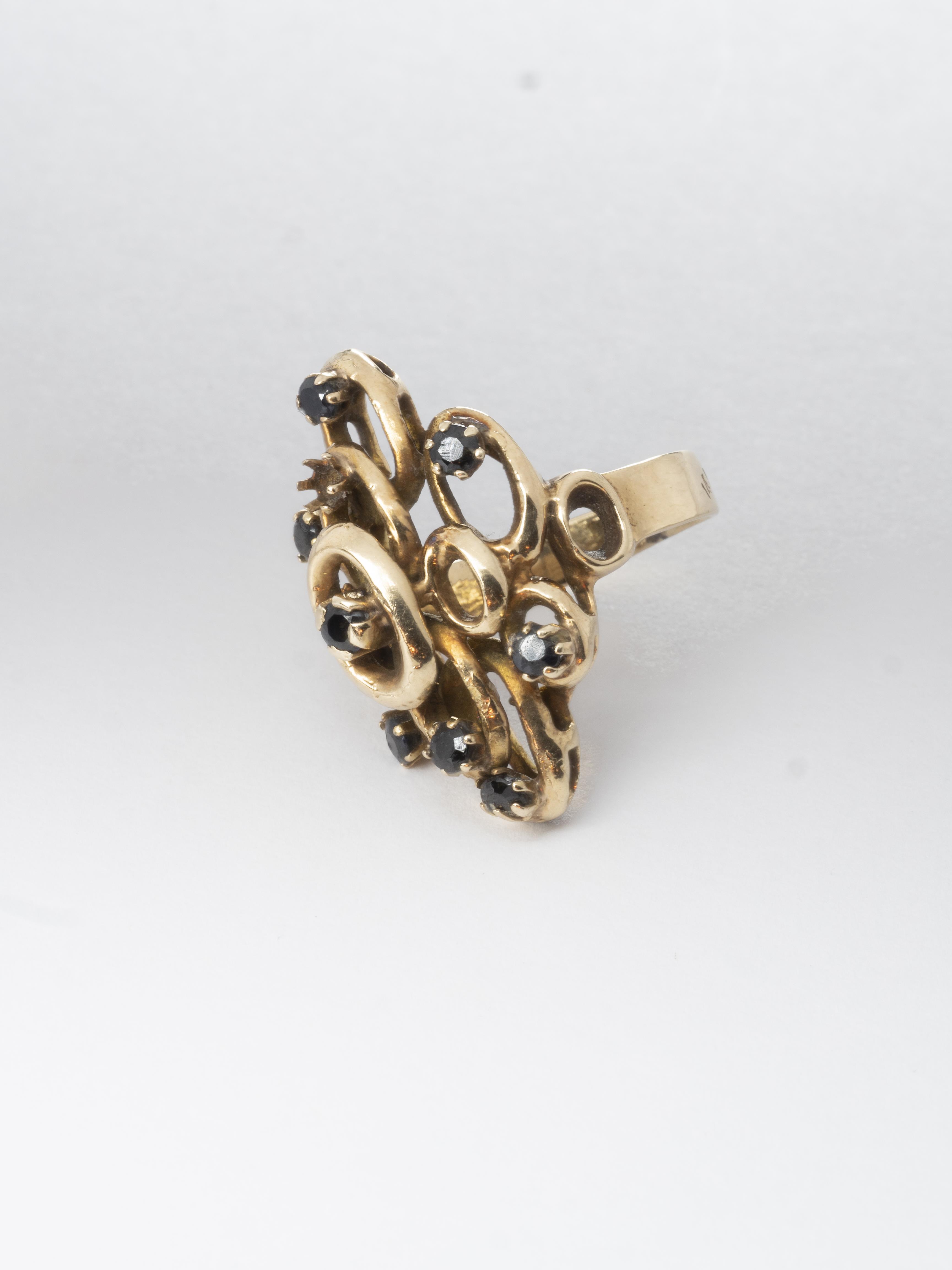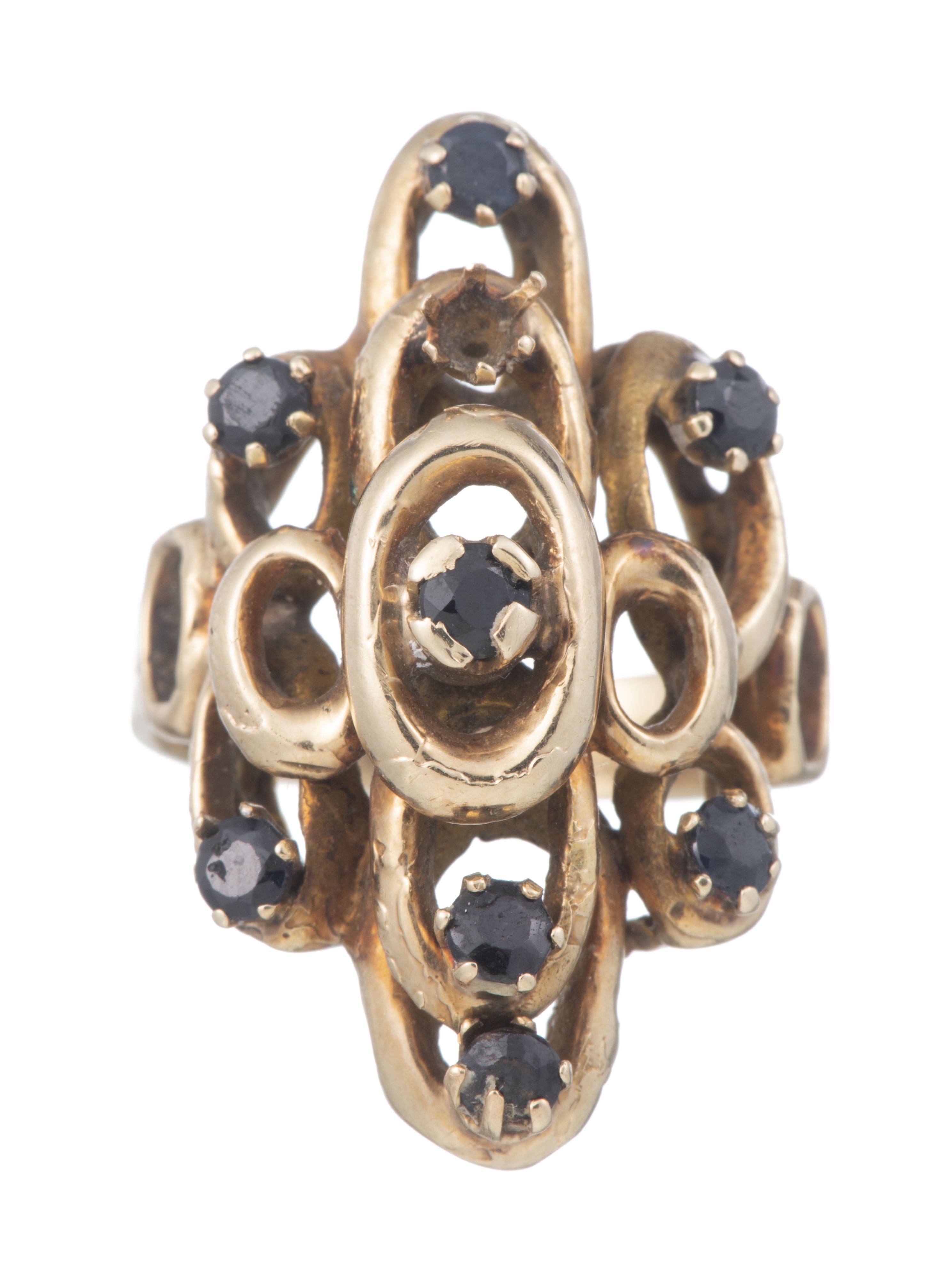 Bague en or jaune .585 en forme de 11 ellipses superposées sertie de 8 saphirs bleus (1 manquant) pour un total de 0.40 ct.