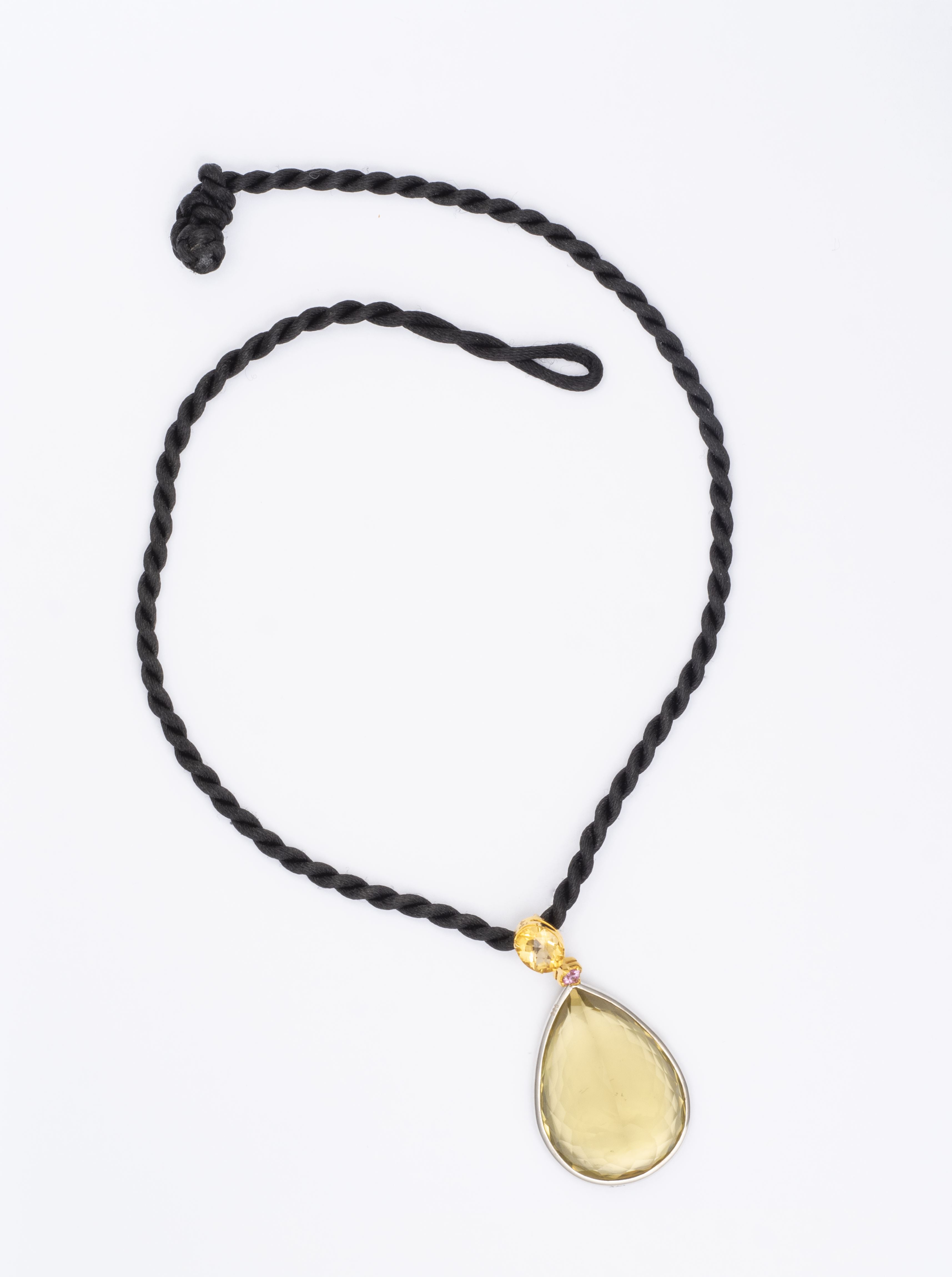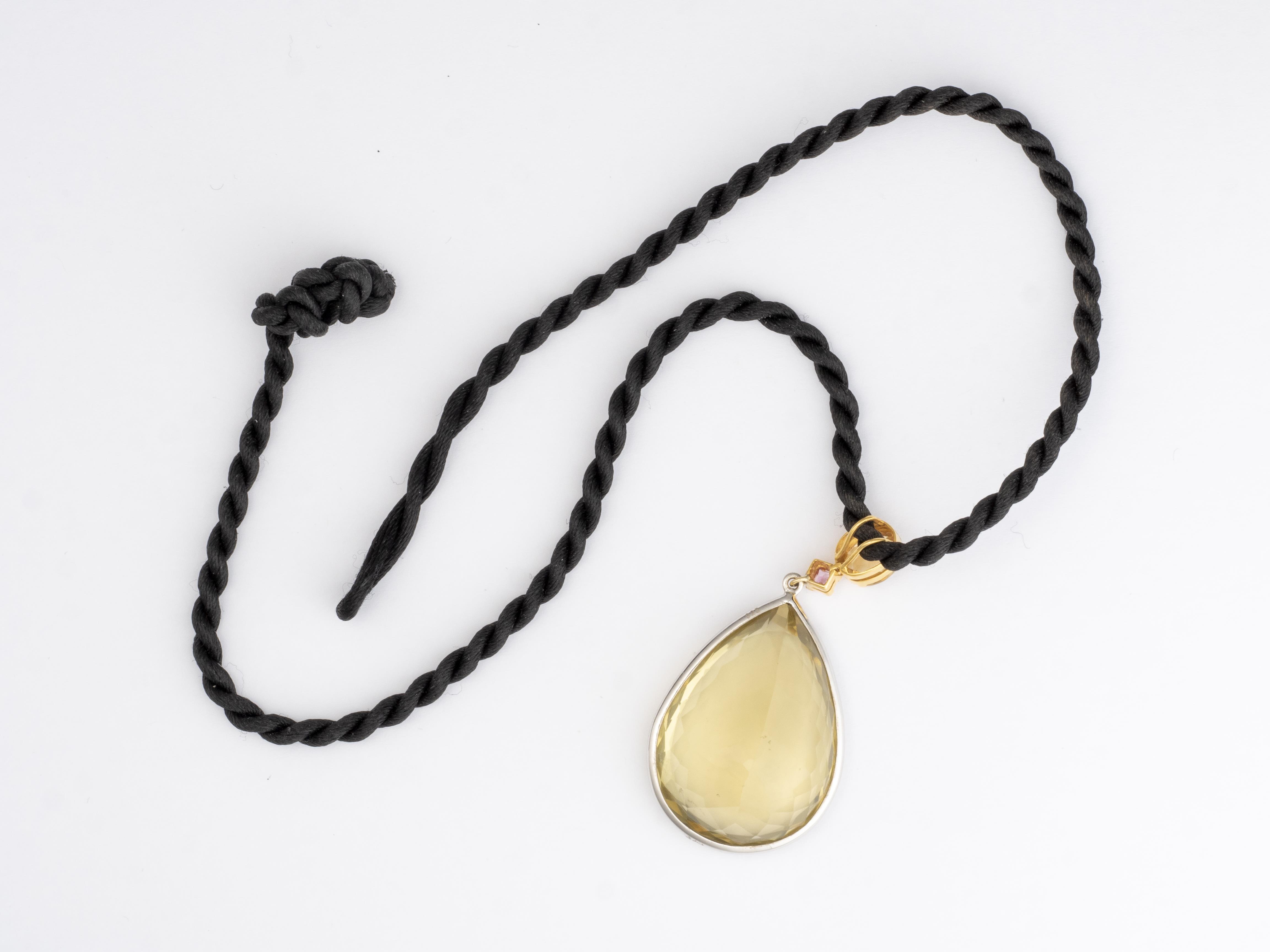 Pendentif en or .750 et argent .925 avec une citrine goutte de 69.60 cts sertie clos et une petite citrine de 6.36 cts sertie à griffes et 1 saphir rose de taille carrée sertie à griffes, sur une cordelette.