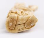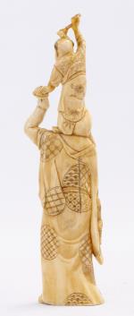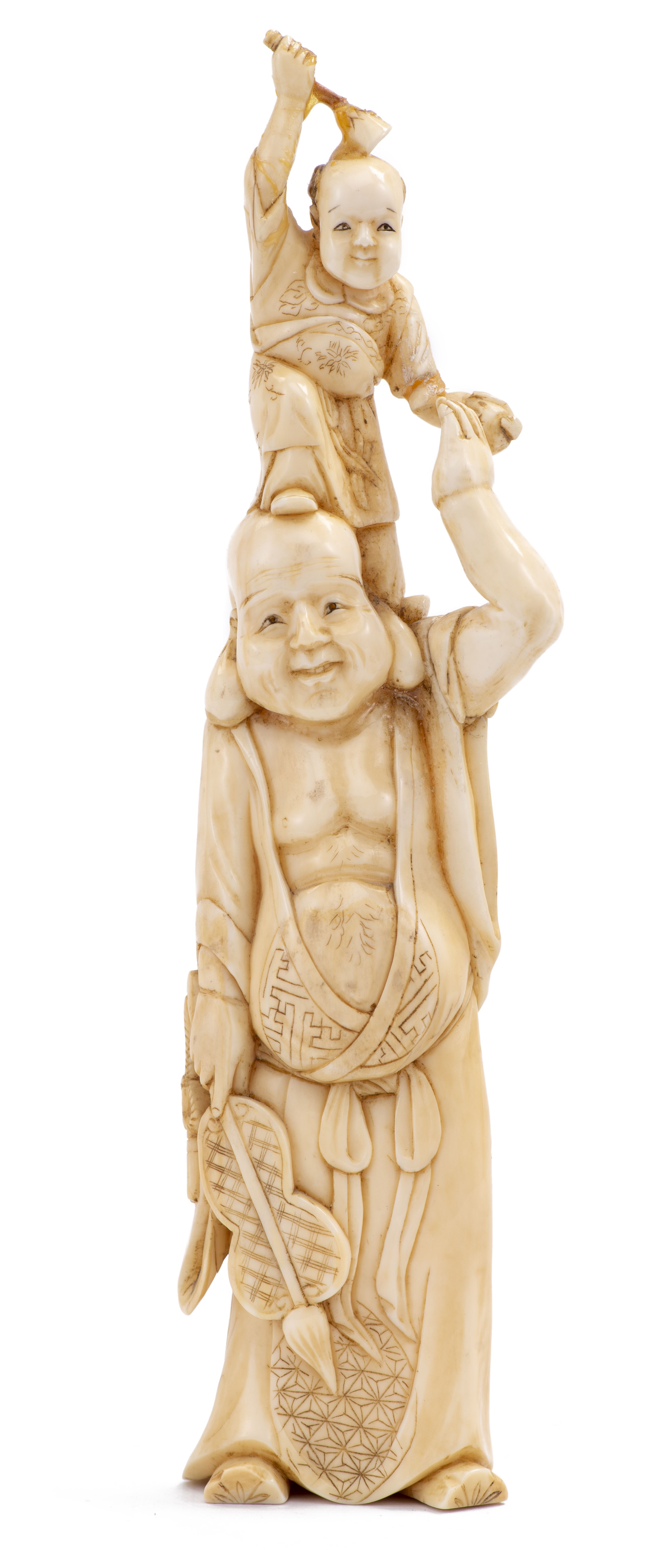 Okimono en ivoire du Japon représentant un jeune garçon hissé sur l'épaule et la tête se son grand père tenant une pêche de longévité dans sa main gauche et une cloche dans sa main droite.
