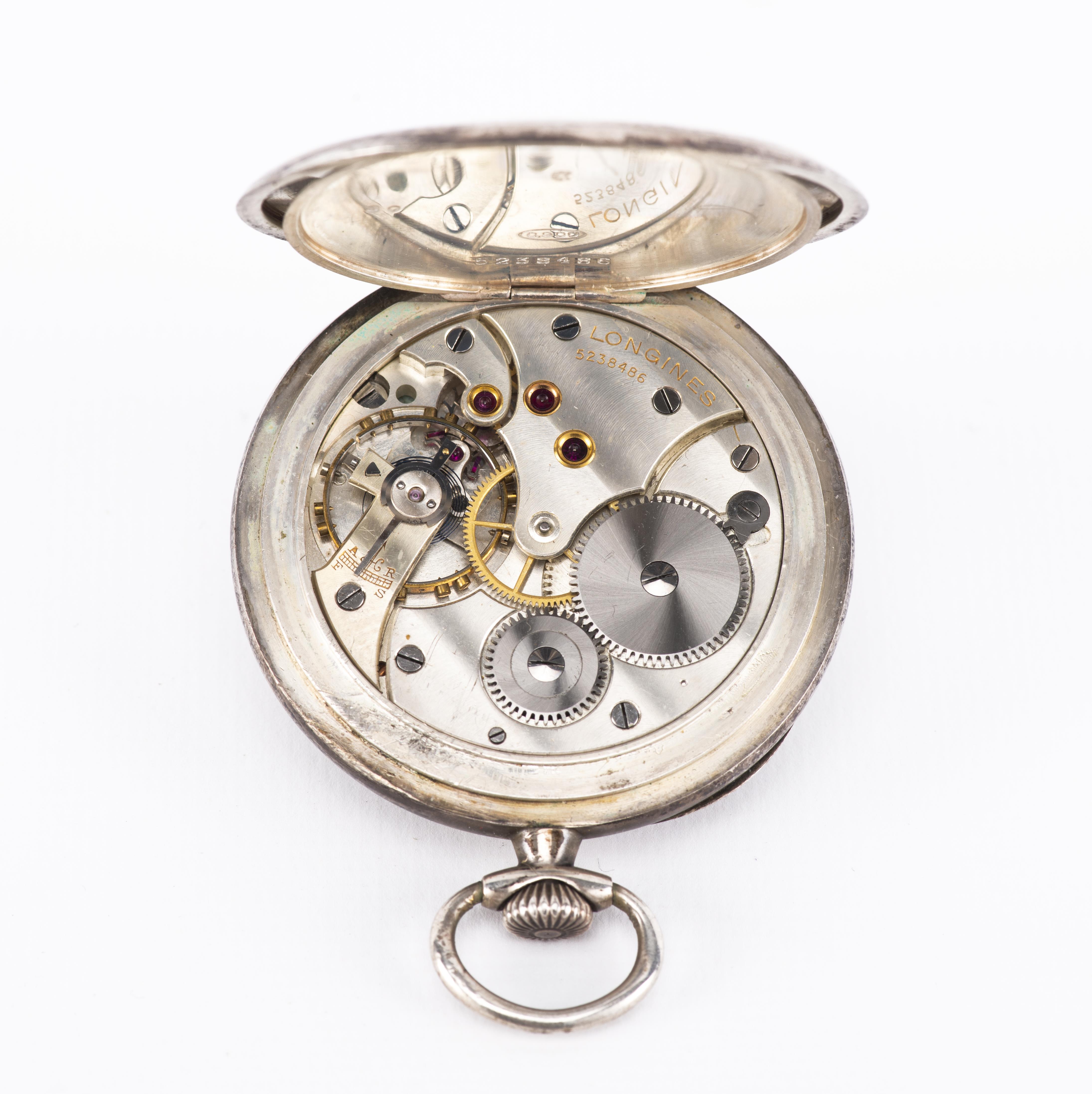 LONGINES, (Longines Watch Co Francillon Ltd) montre de poche à CAL. Lépine 18.69 Z, boîte en argent .900 à la pintade et mvt n° 5238486, cadran blanc et chiffres arabes inscrits en noir pour les heures et les secondes. aiguilles en or probablement changées. D. 47 mm,