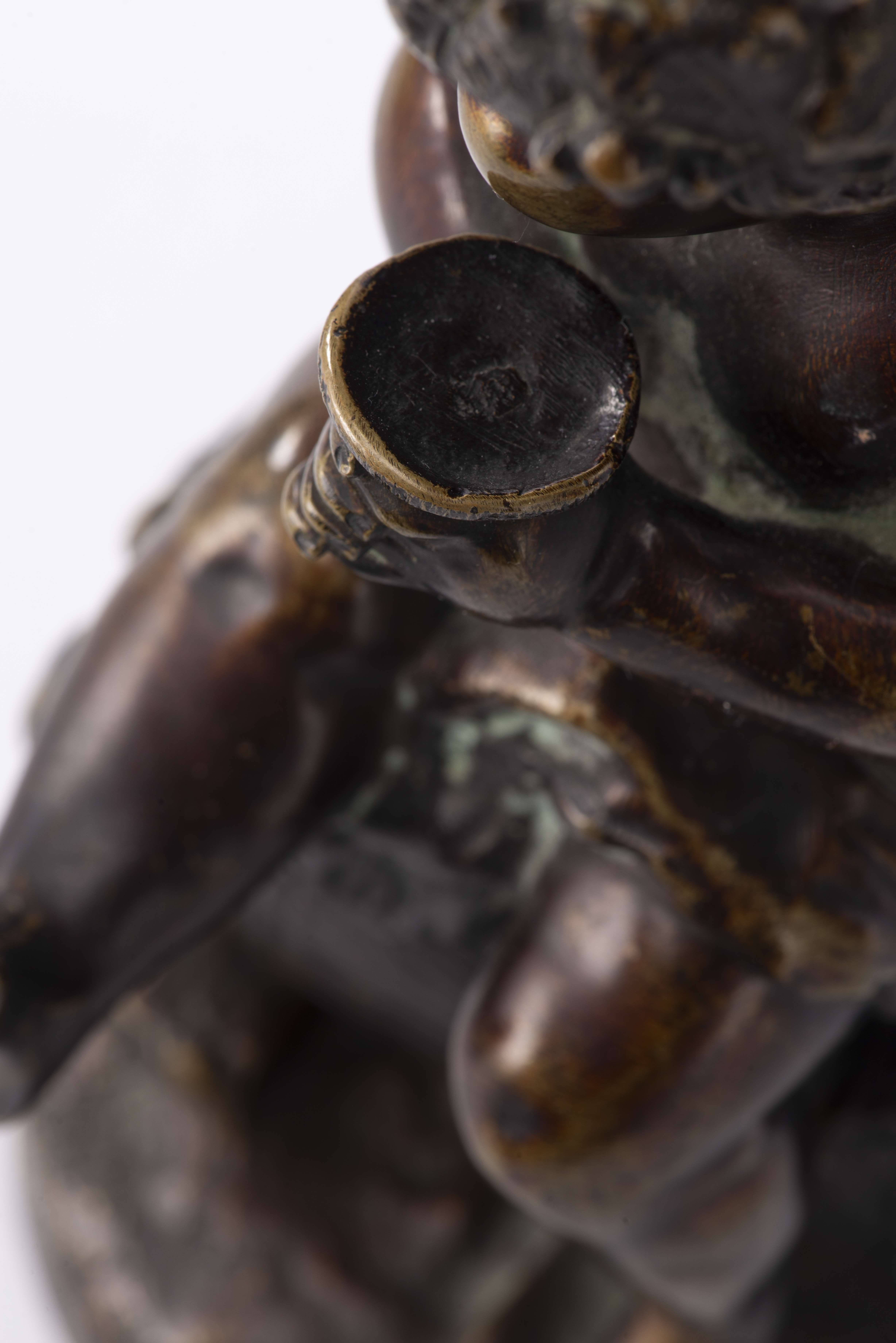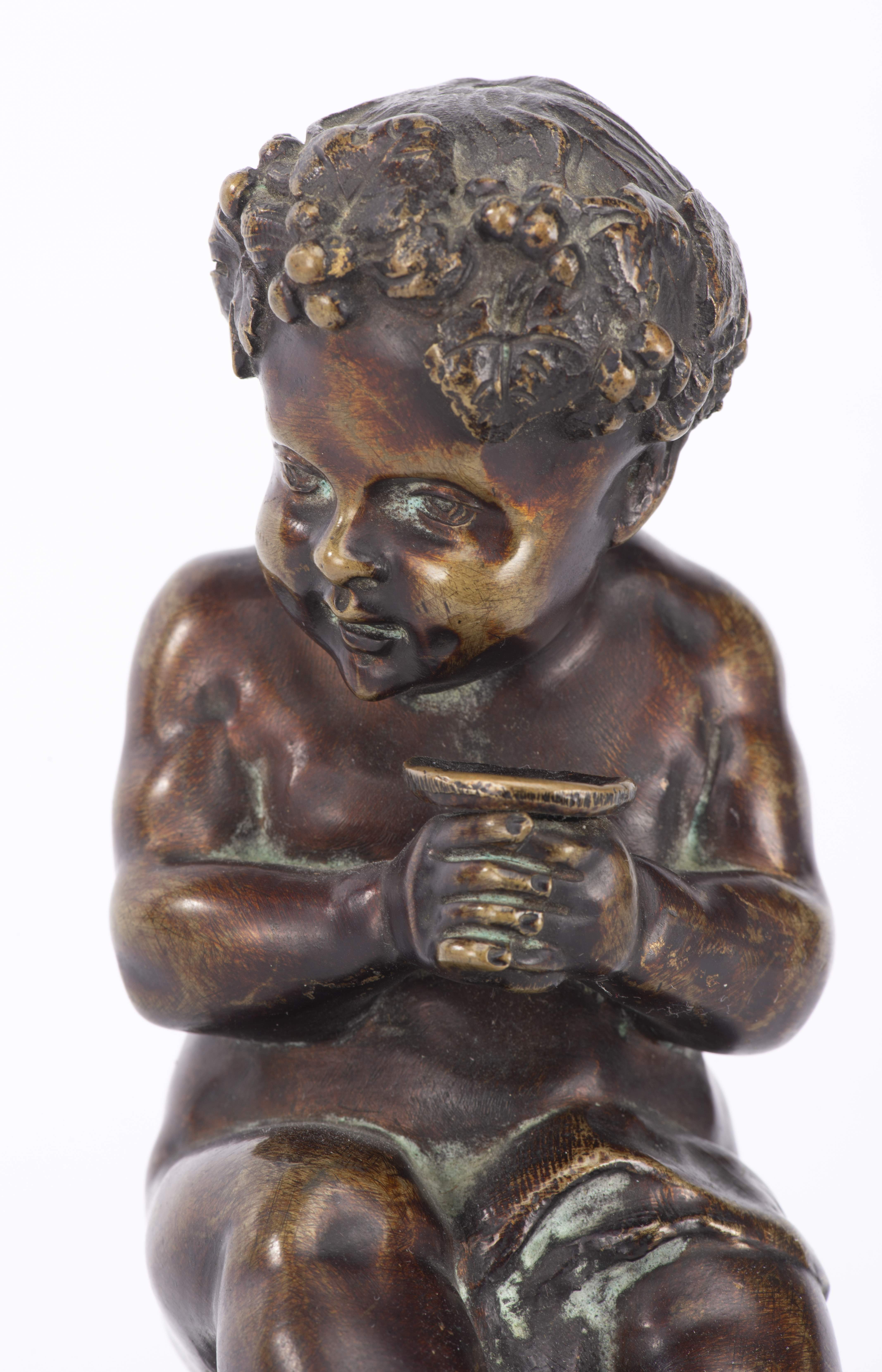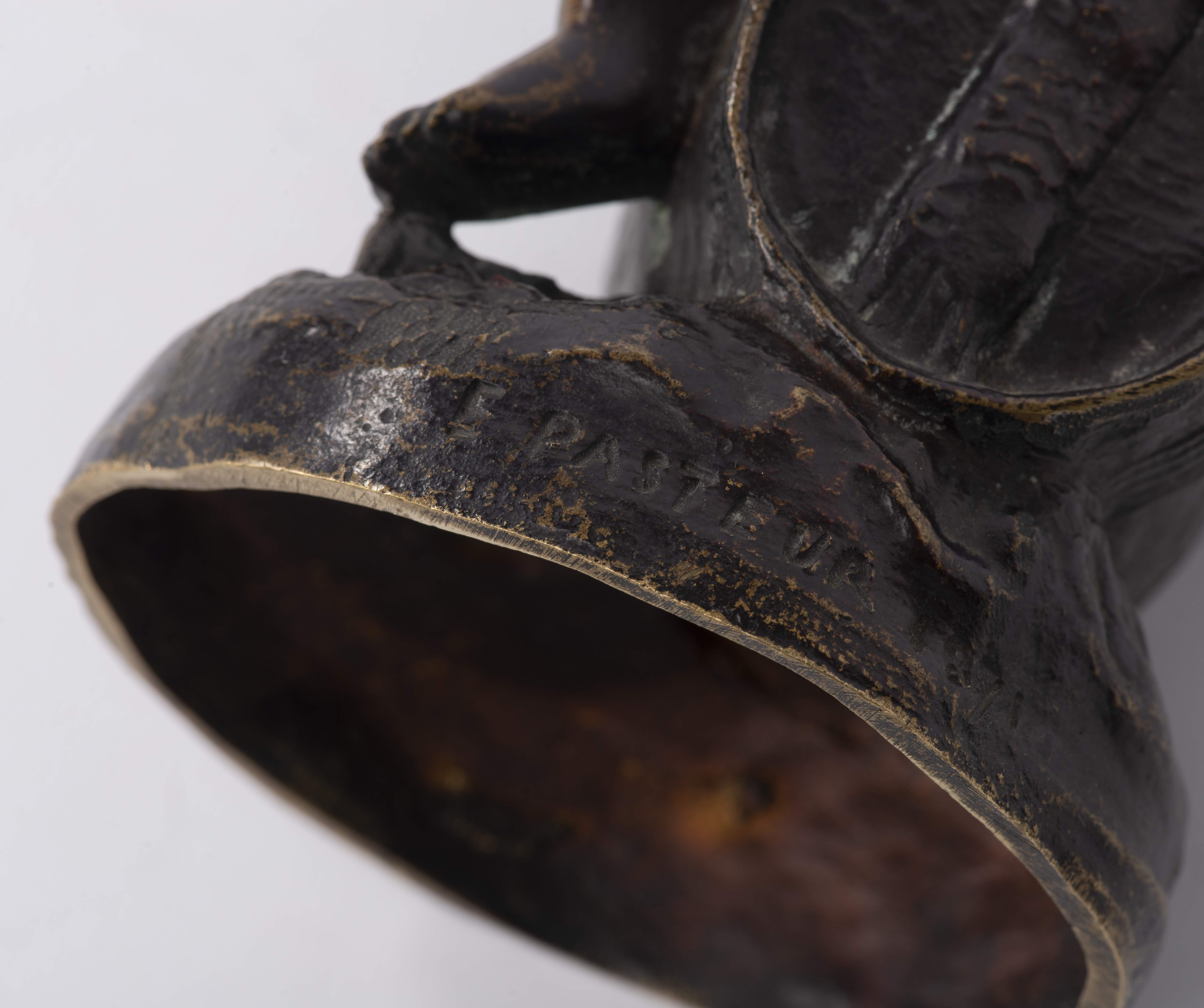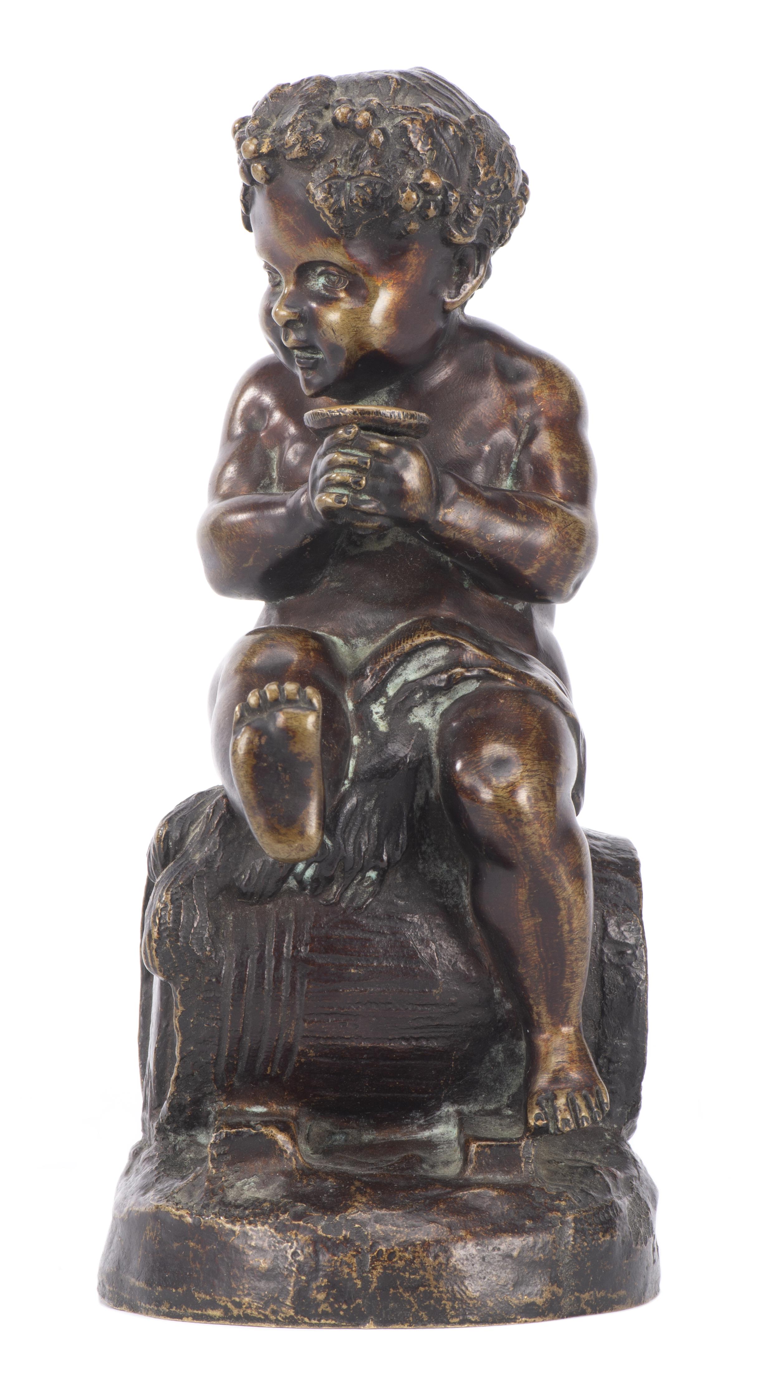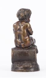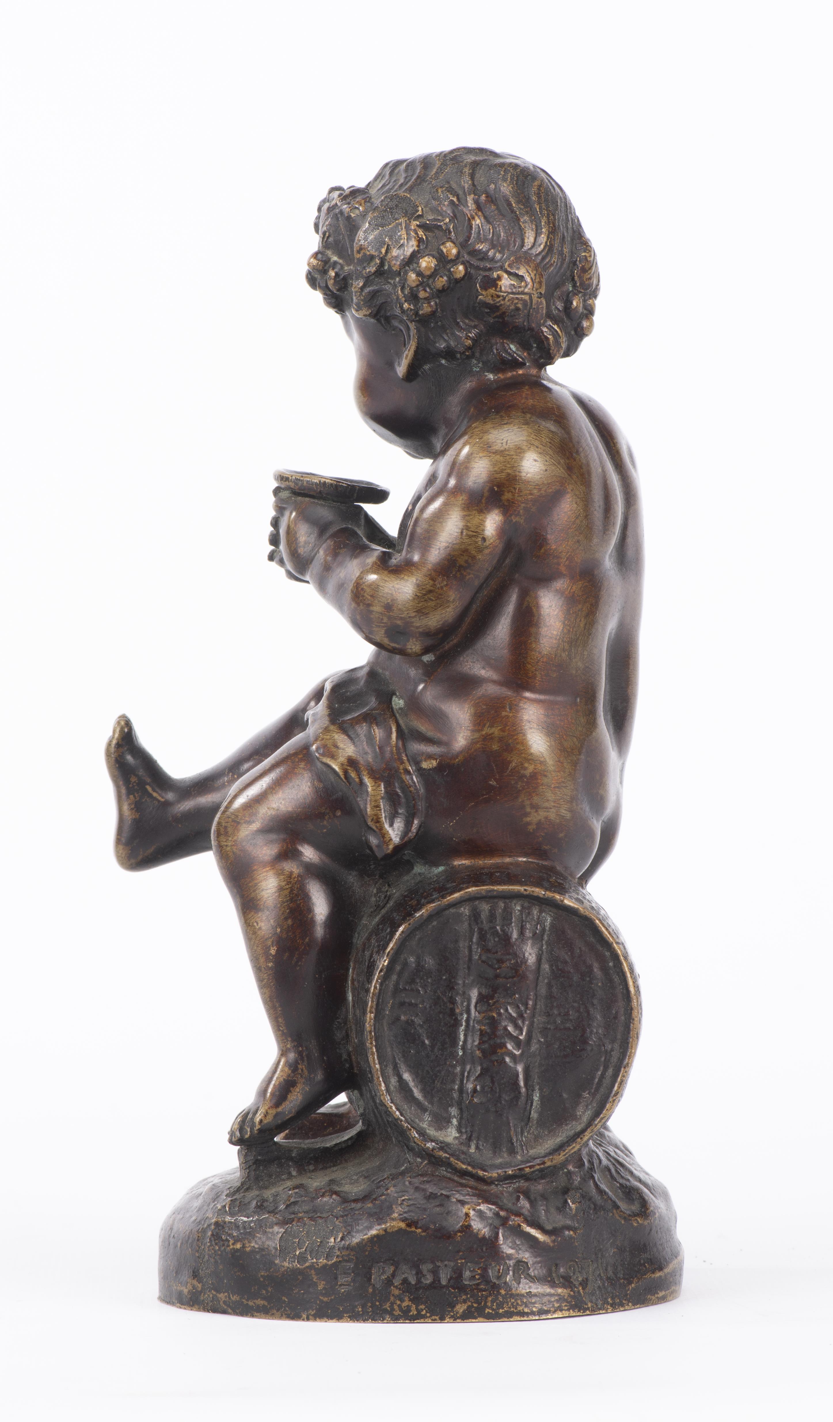 E. PASTEUR (XIXe), "Enfant assis sur un tonneau", sculpture en bronze, signé vers la base, daté 1871.