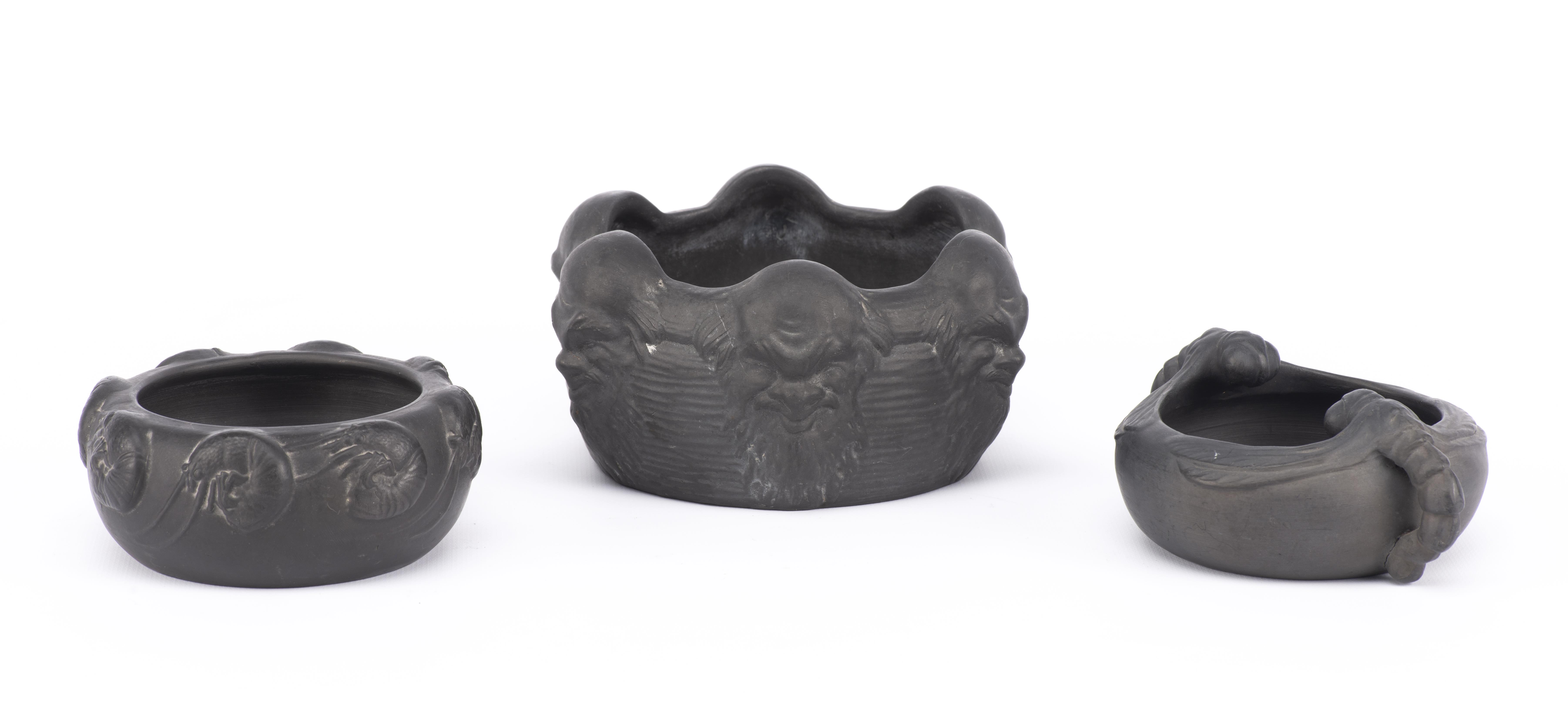 Lauritz HJORTH (1834-1912) à Bornholm, 3 vide-poches en terre cuite noire vers 1900, l'un à décor de têtes barbues, un autre à décor de langoustes, le troisième, à anses en forme de libellules. cachet au dos n° 768, 761 & 742.