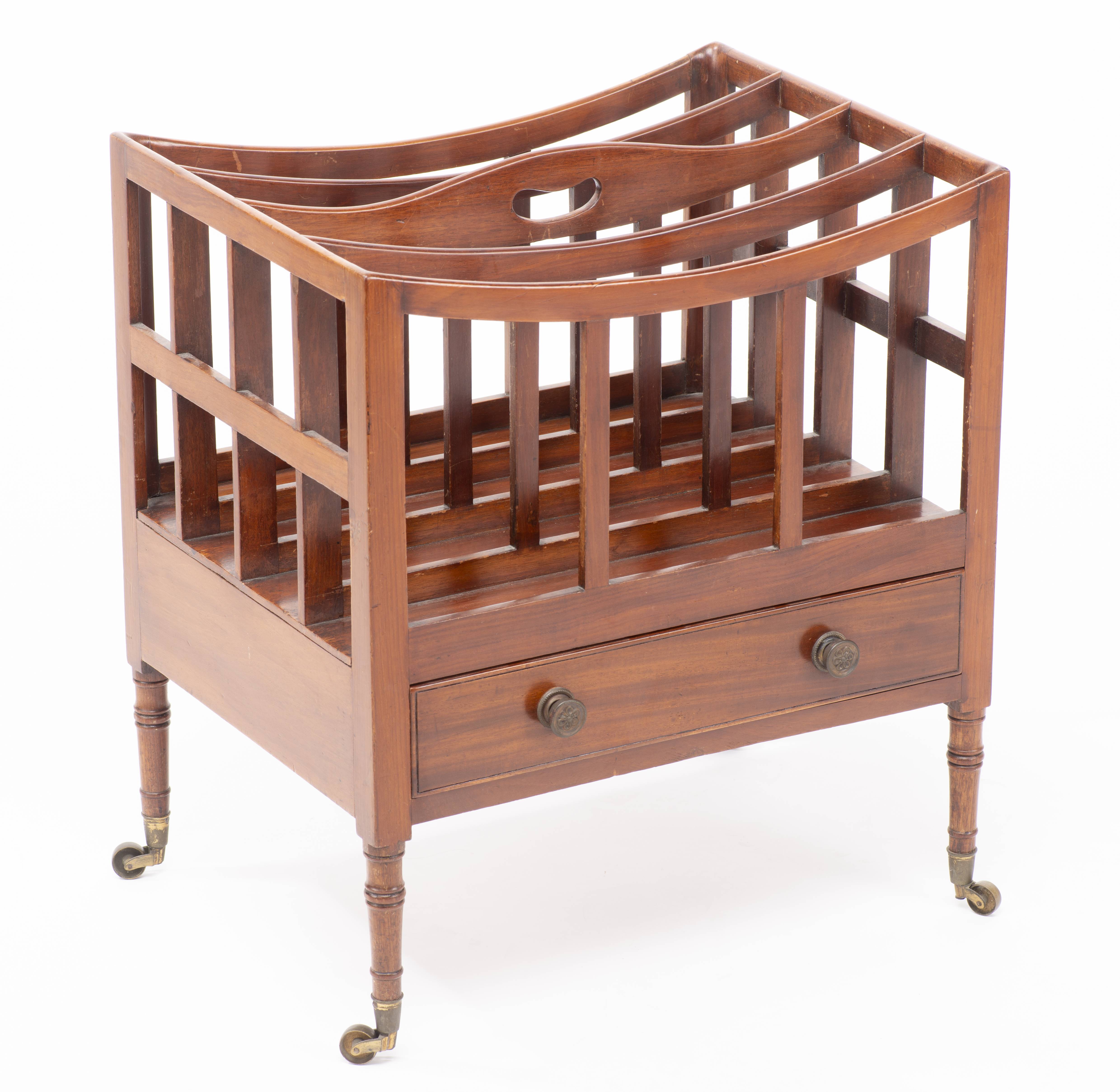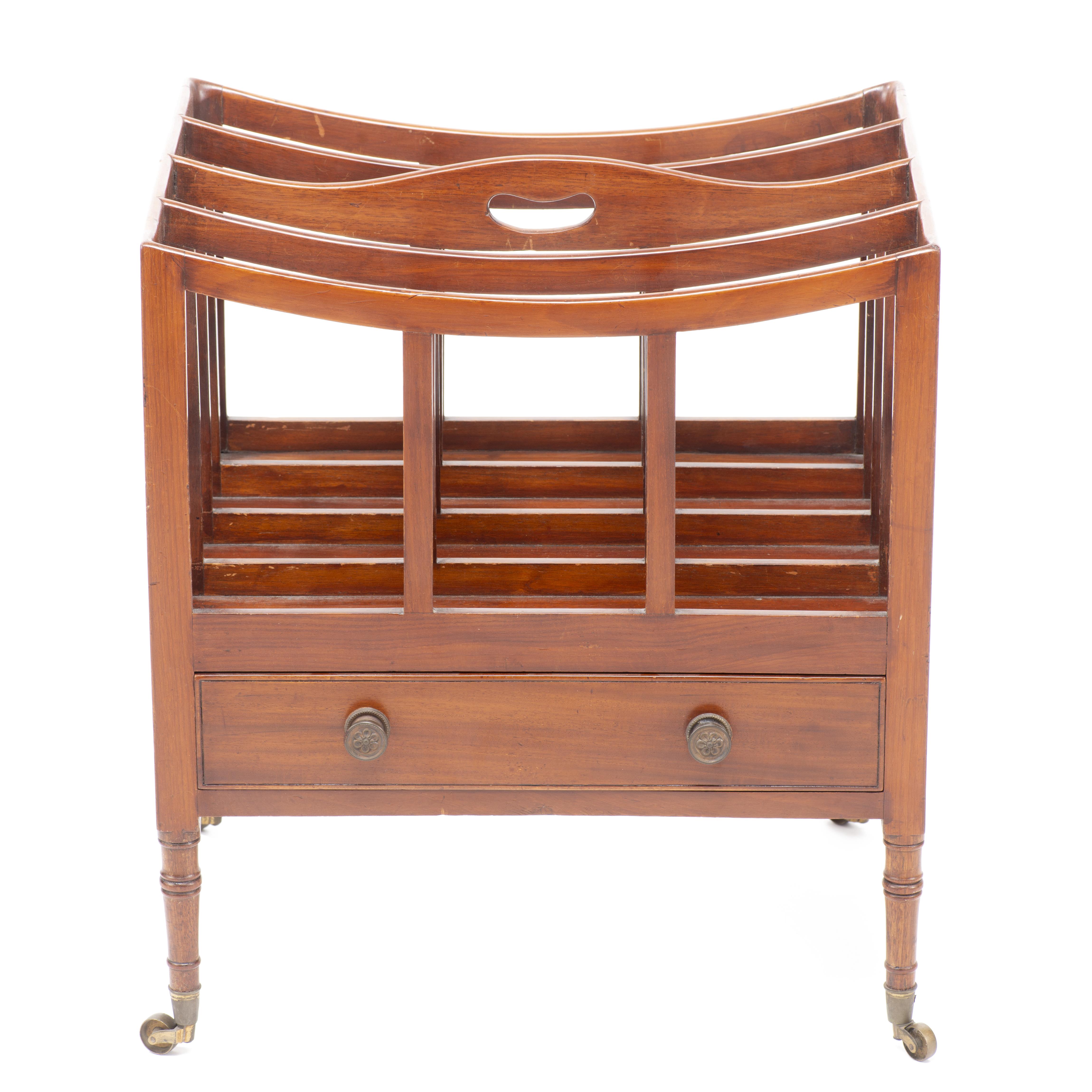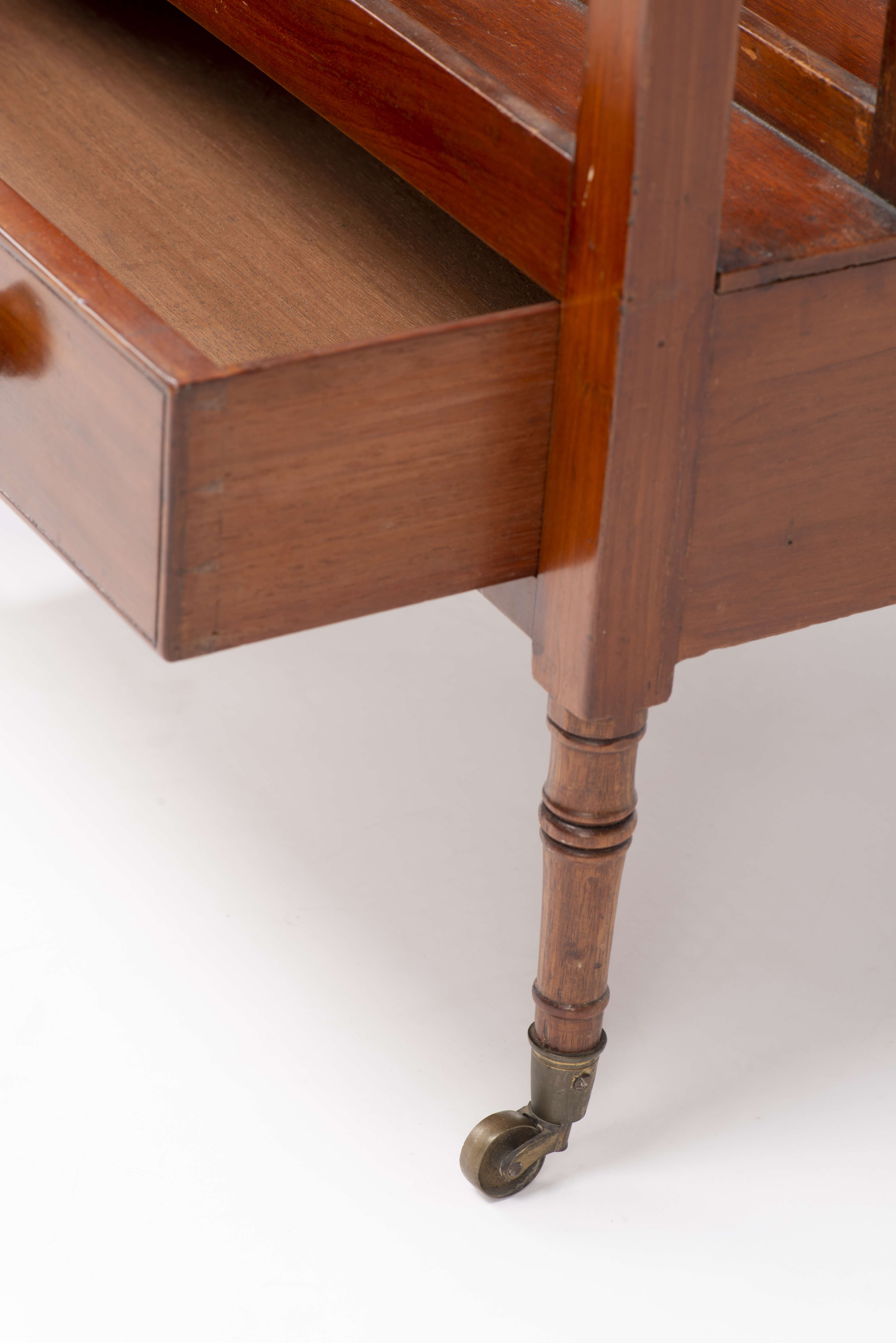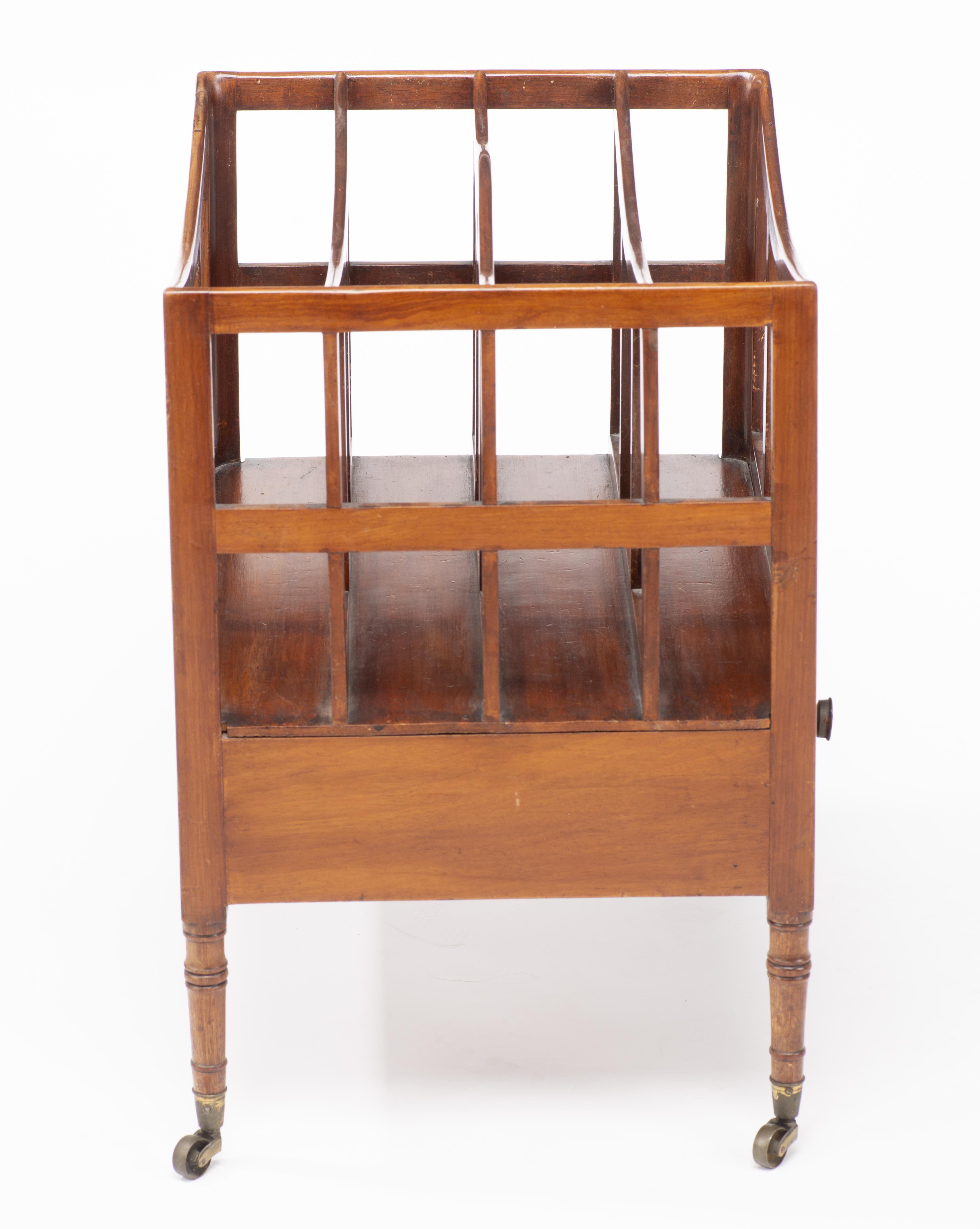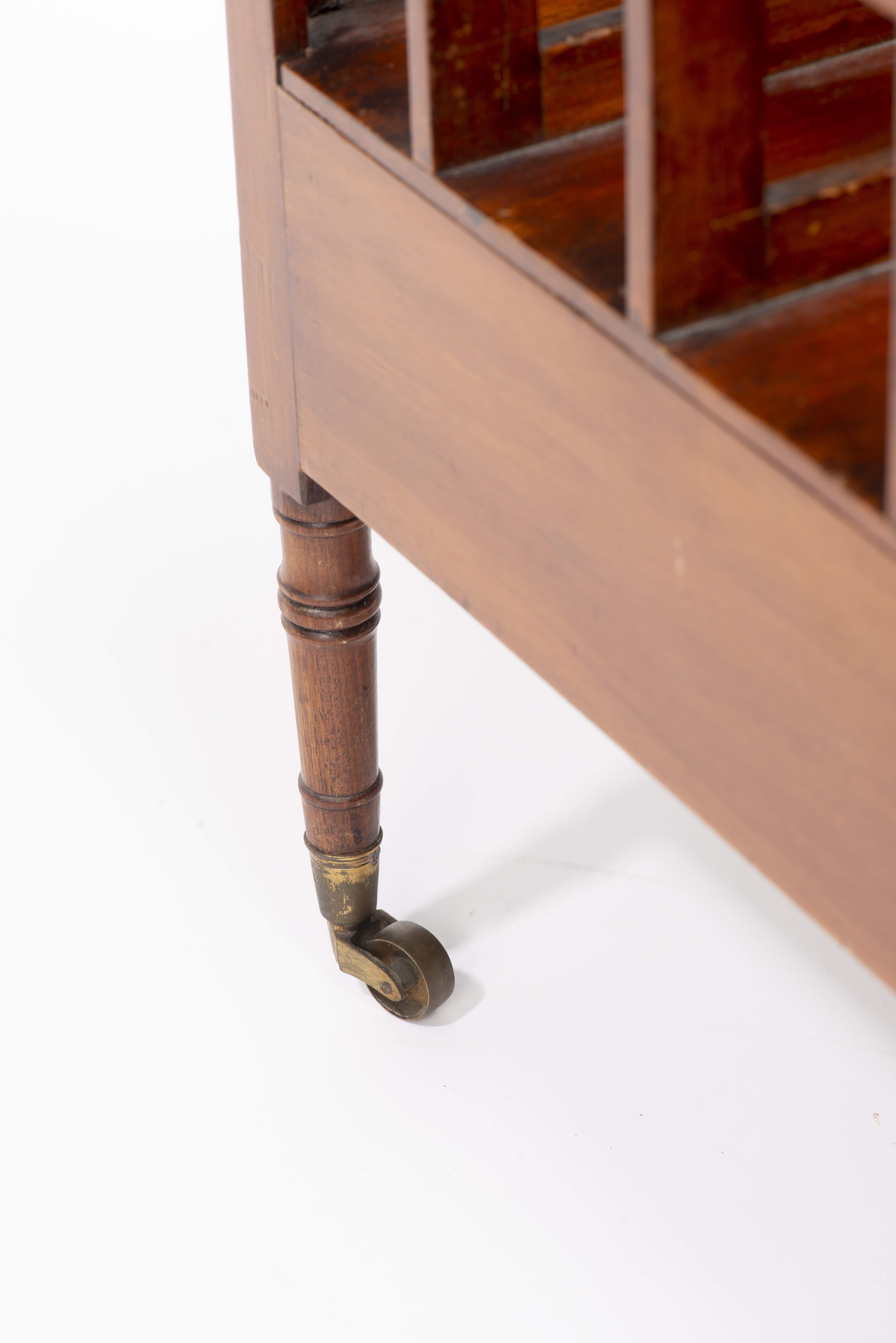 Porte-journaux ou "Canterbury" en acajou massif anglais edwardien sur roulettes avec un tiroir sous le présentoir.