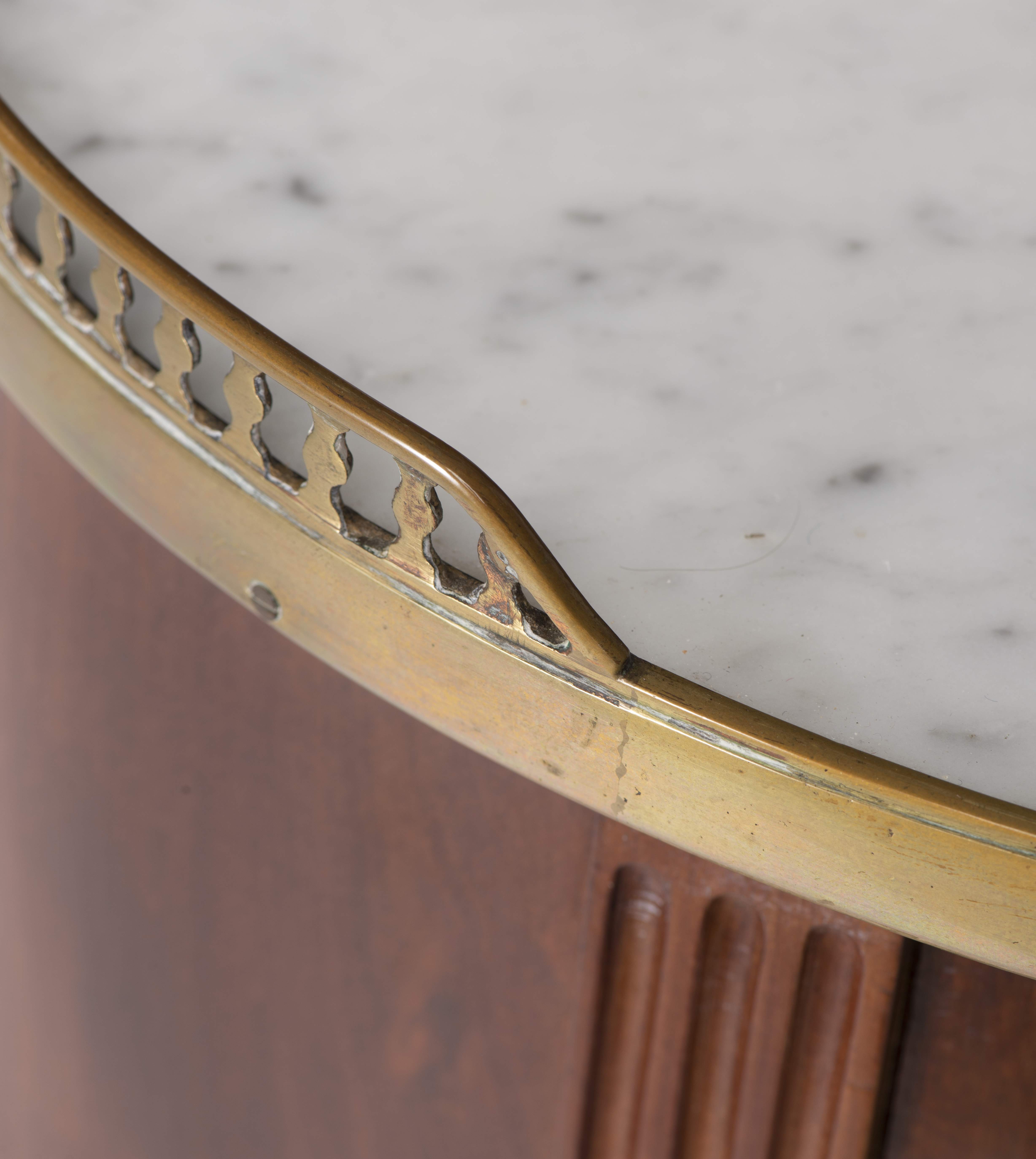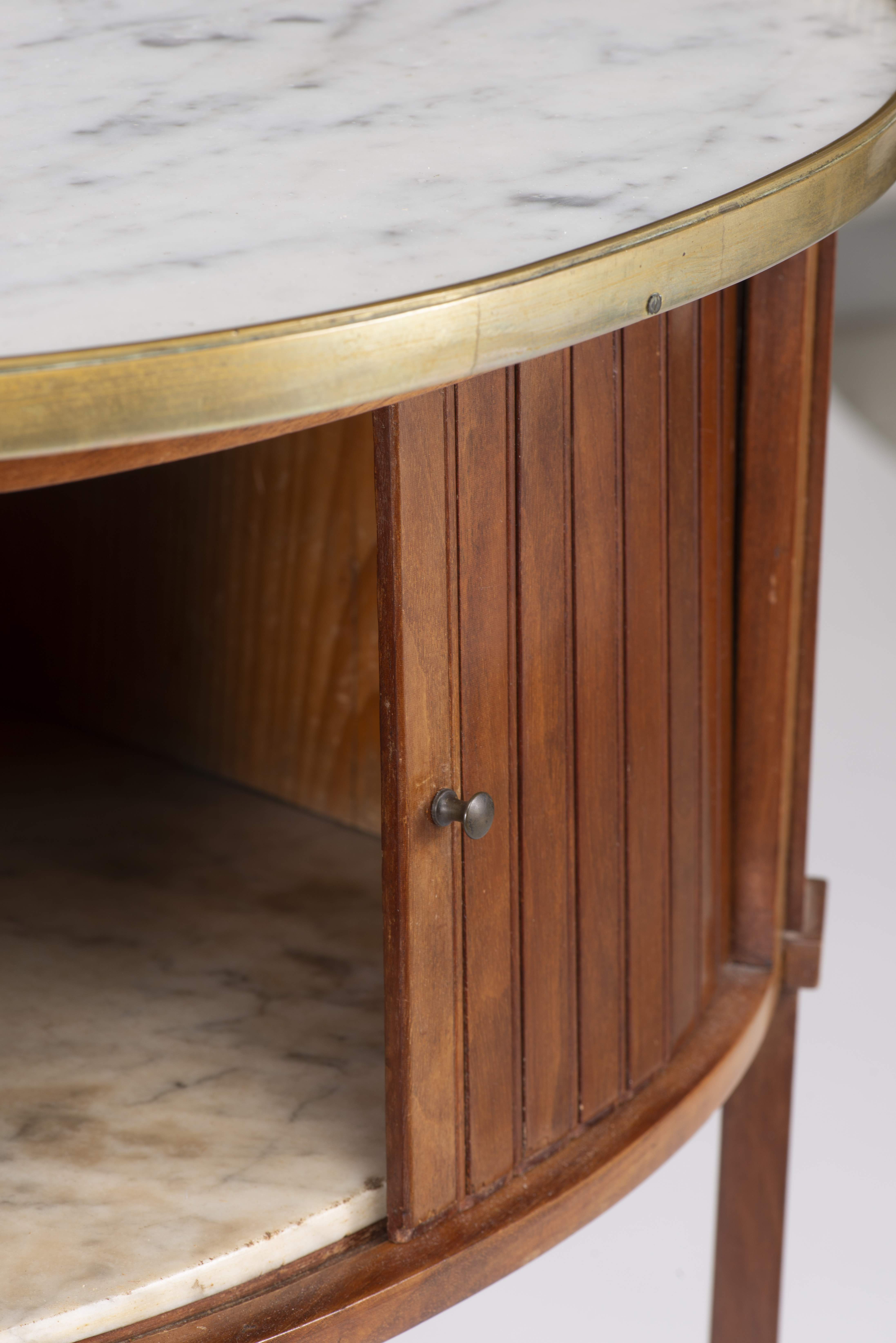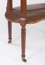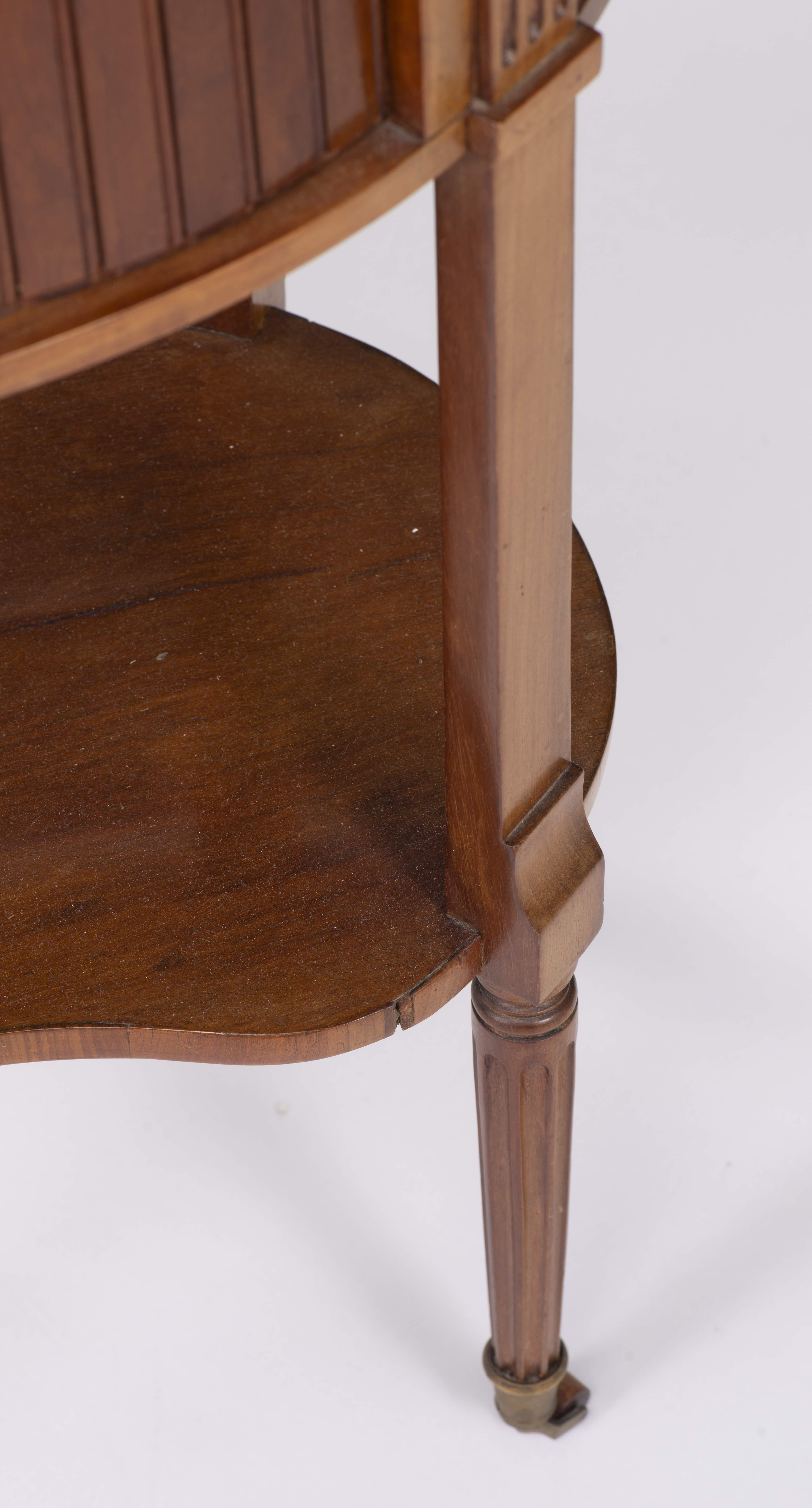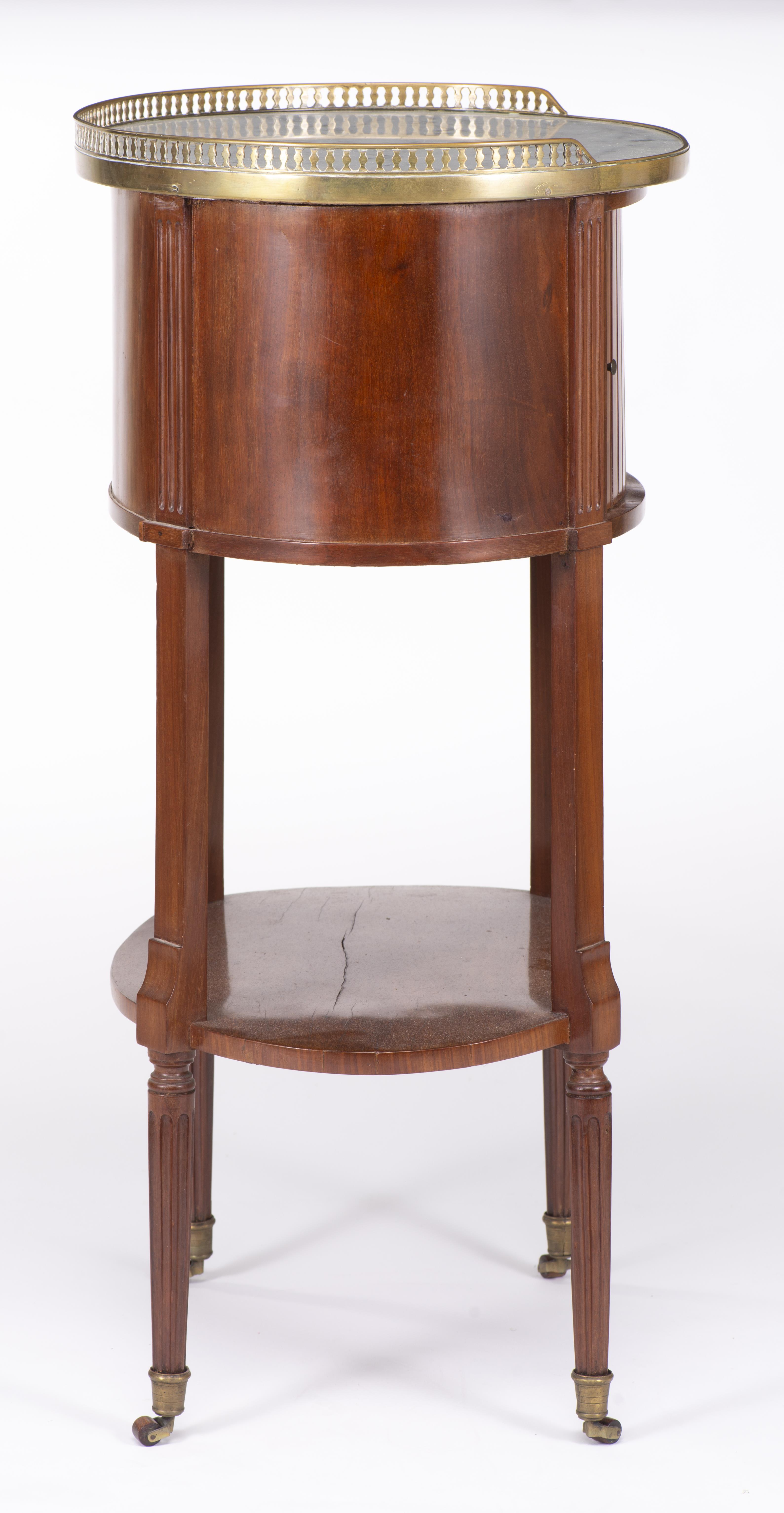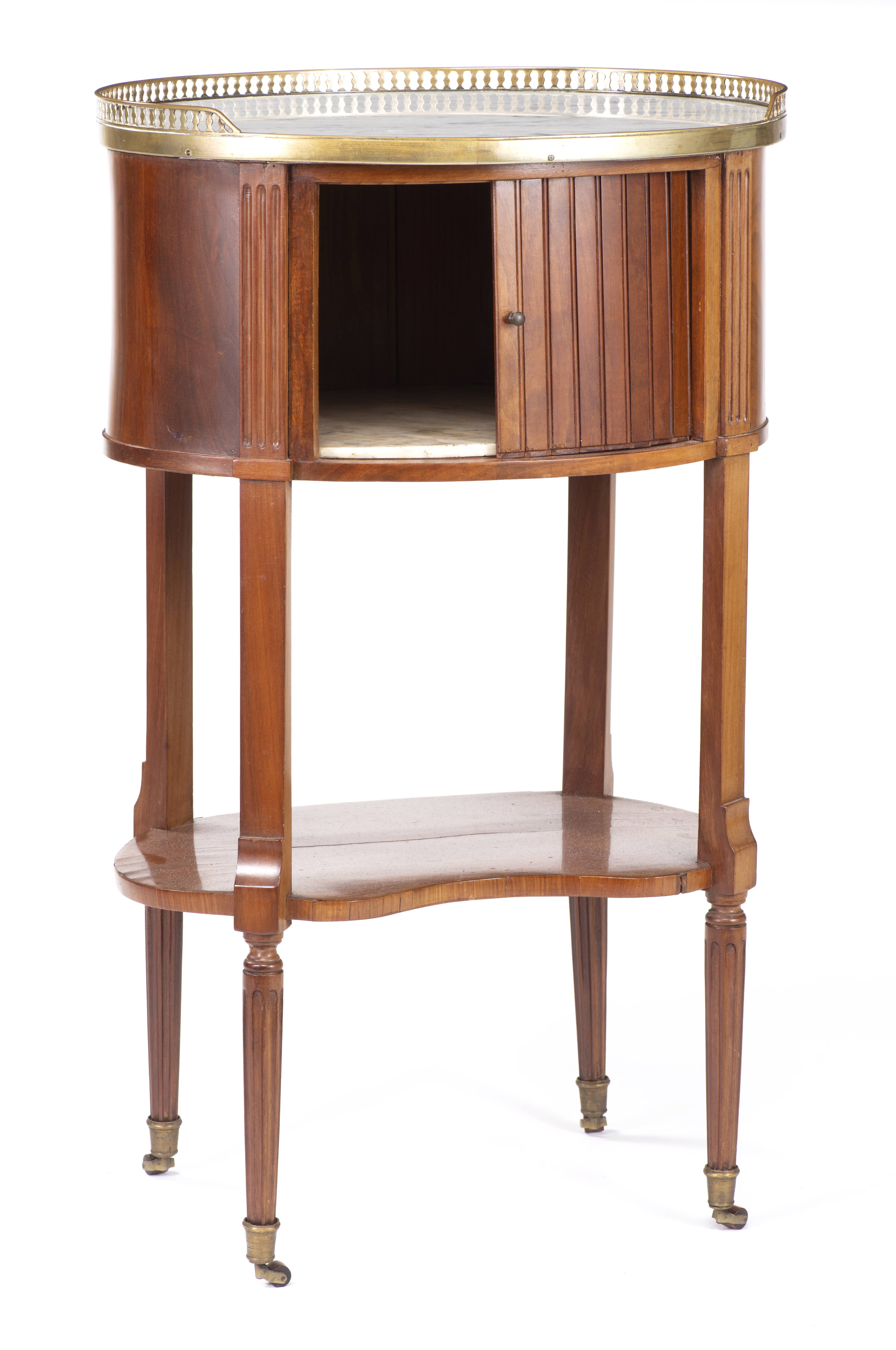 Petit meuble volant Louis XVI de forme rognon en acajou, niche à rideau et double tablette en marbre blanc, 4 pieds cannelés sur roulettes, tablette inférieure en placage d'acajou sur bâti en sapin, plateau supérieur en marbre avec galerie de laiton ajourée. XVIIIe.