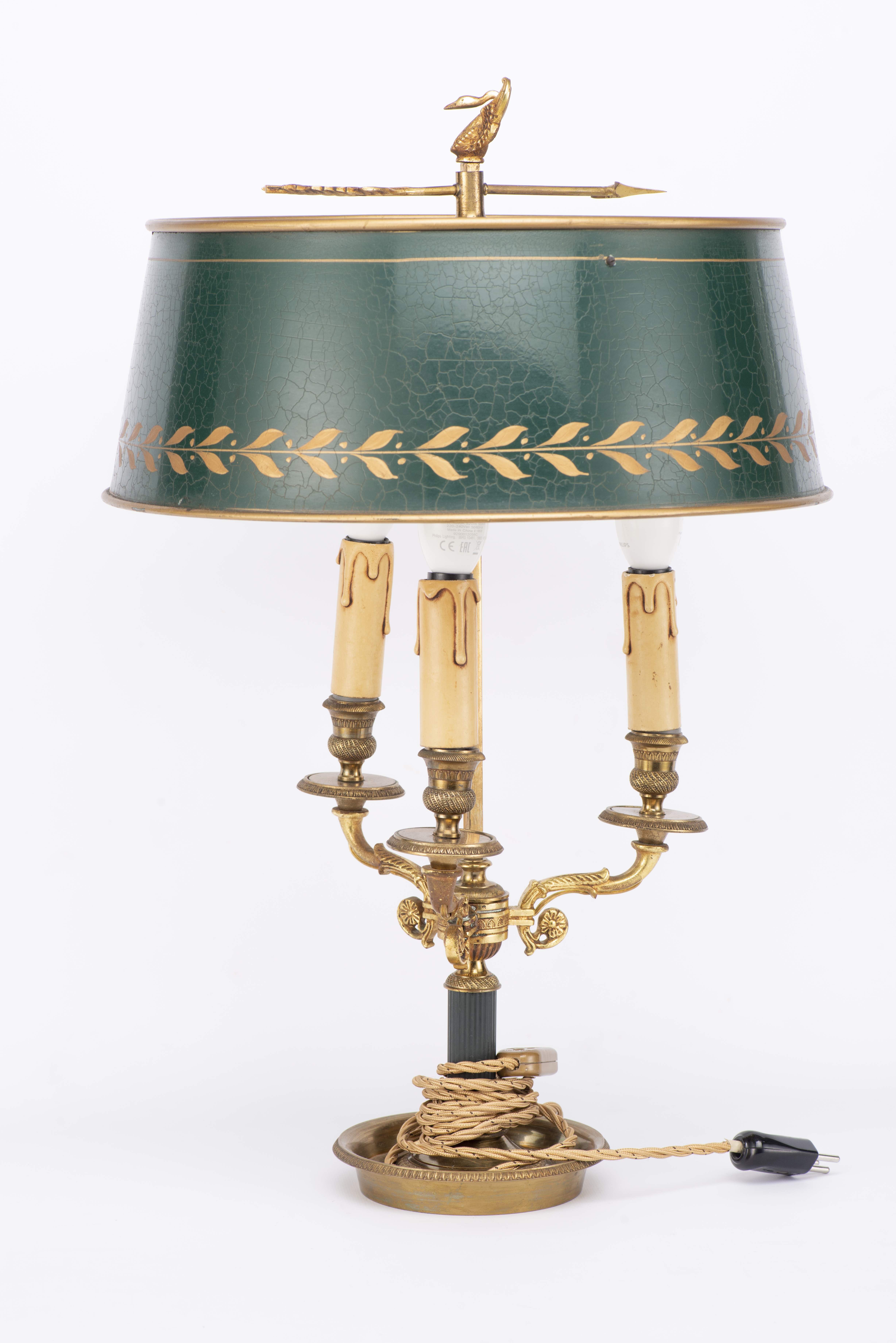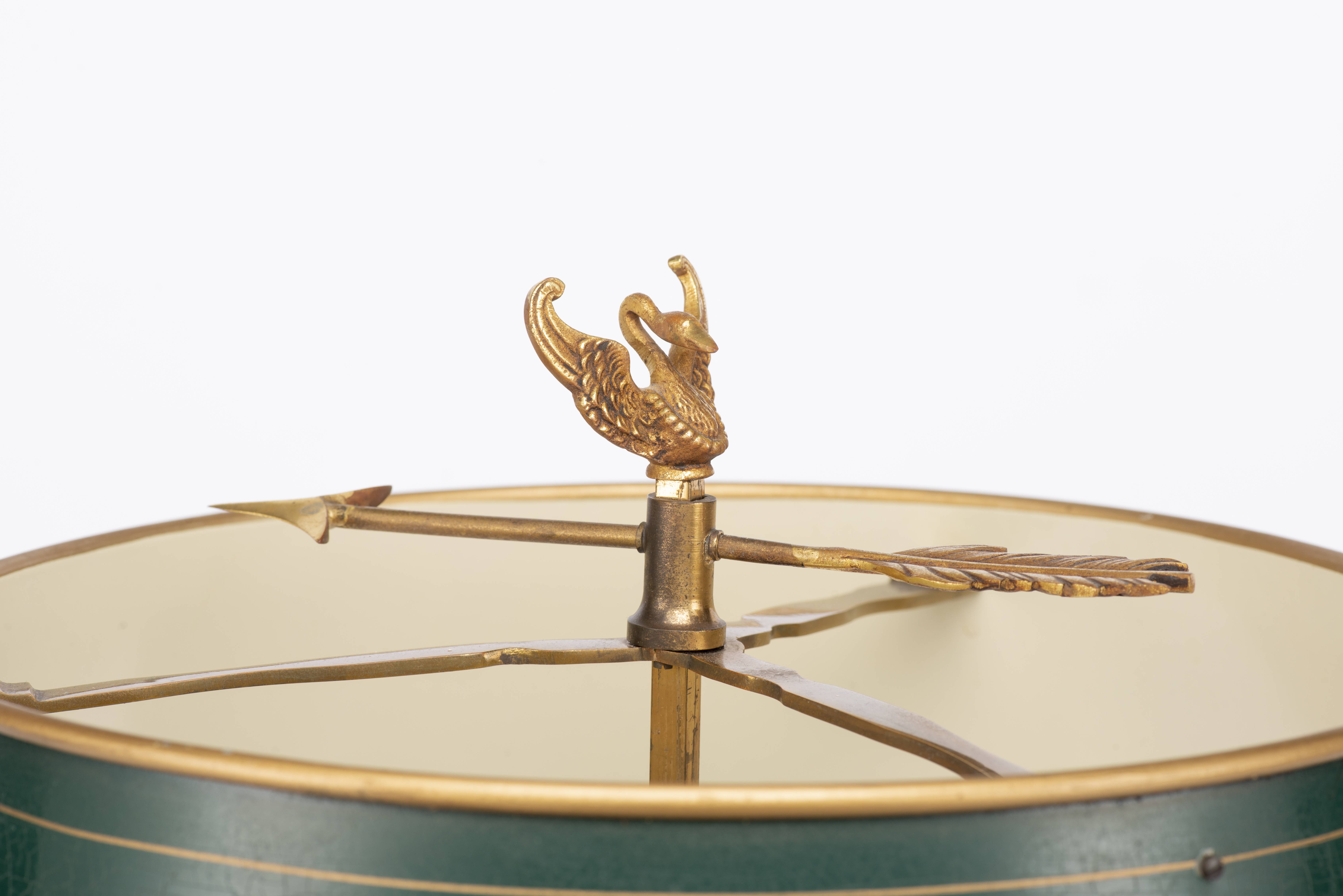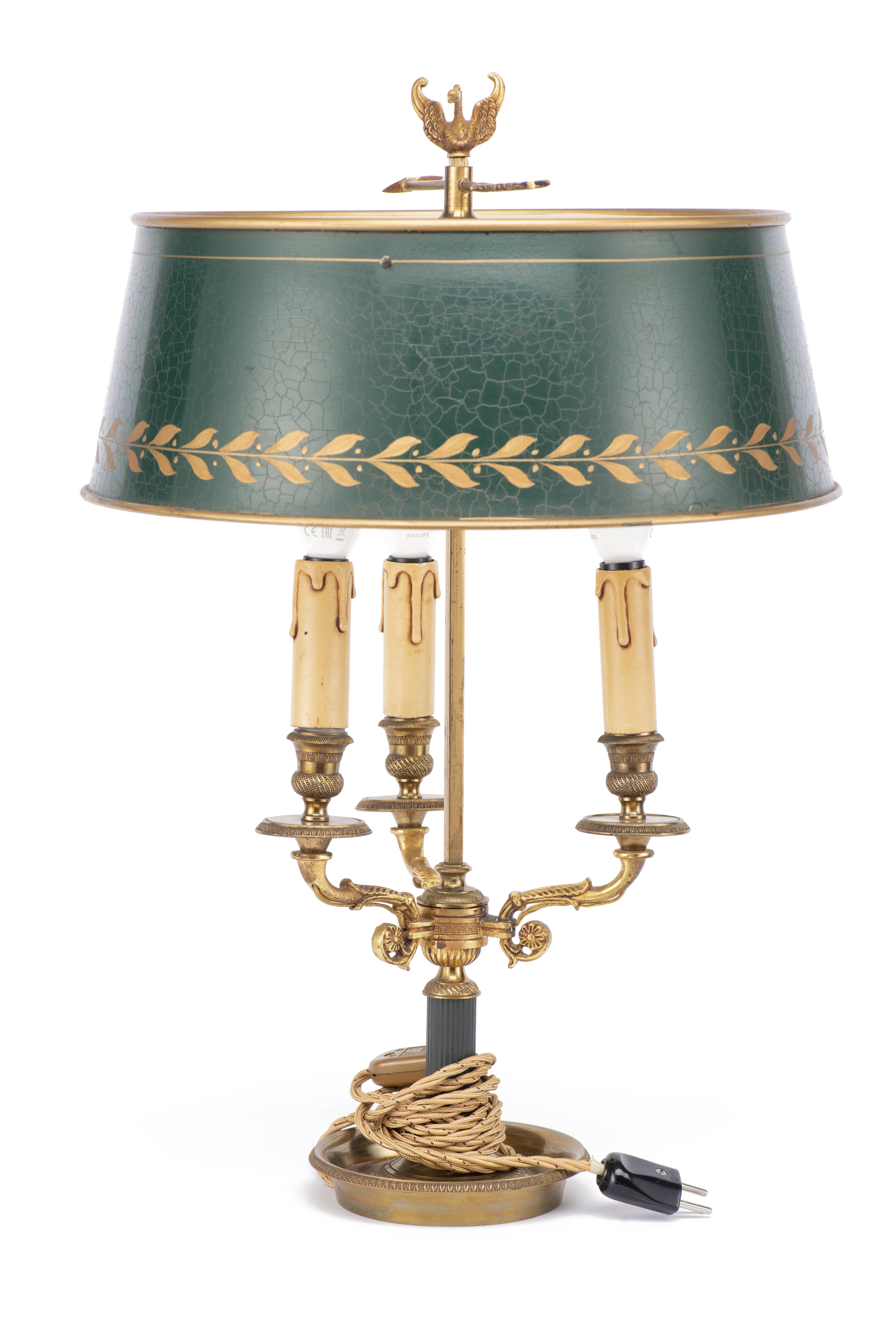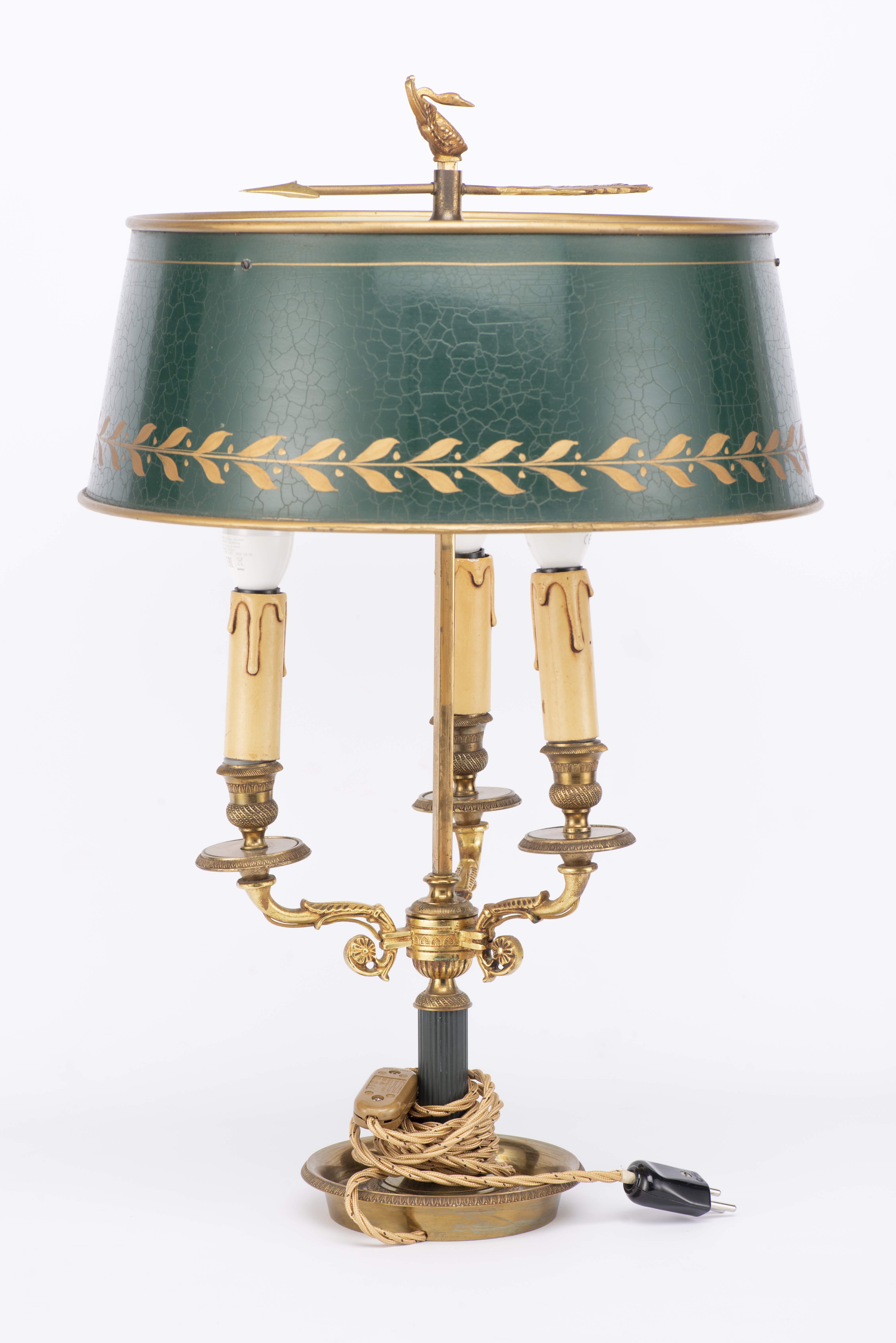 Lampe bouillotte à 3 feux de style Empire en laiton avec abat-jour en tôle peinte.