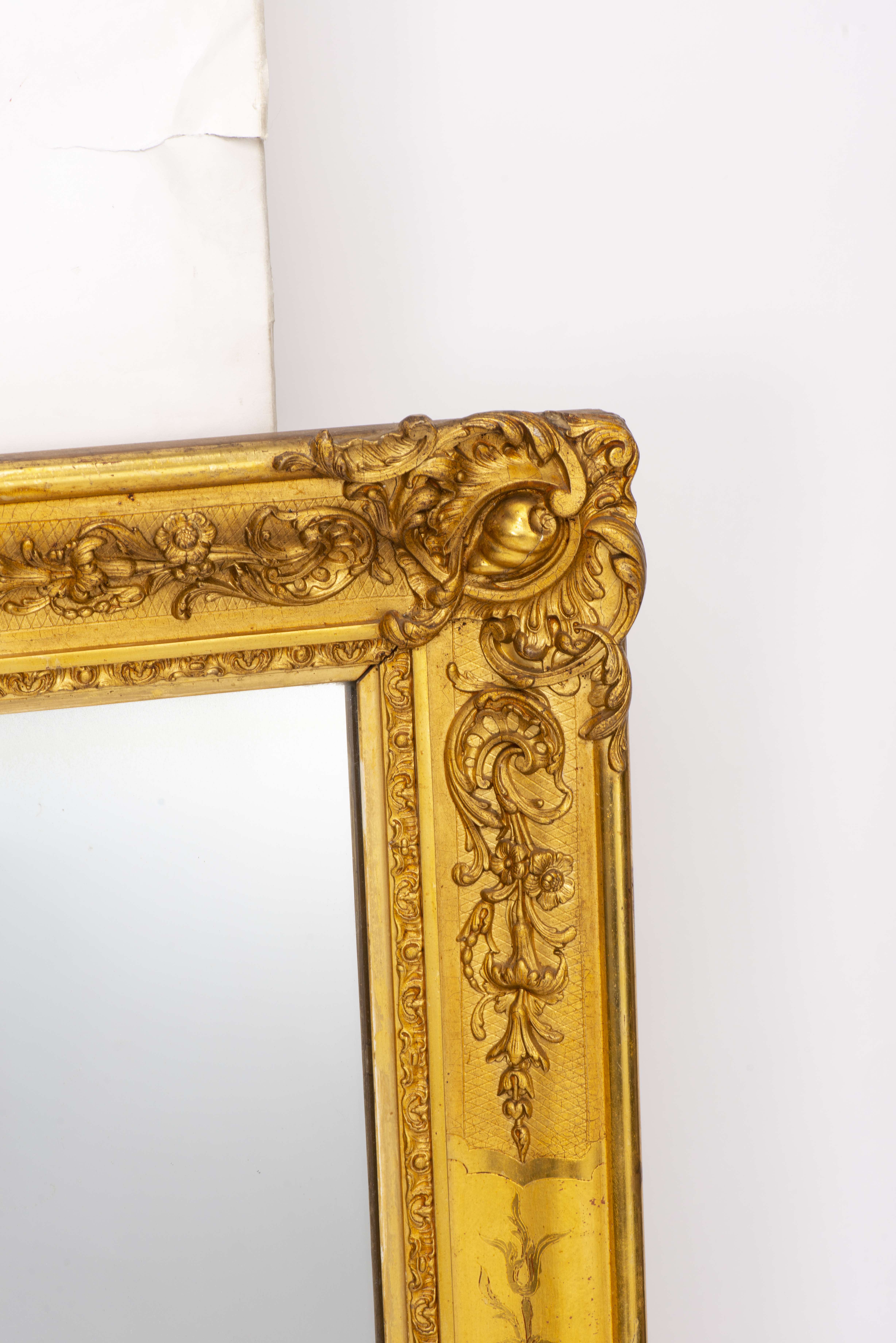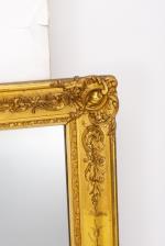 Miroir rectangulaire à cadre en bois et stuc doré à décor de style Nap. III à coins à coquille prolongée de feuilles d'acanthe et branches fleuries.