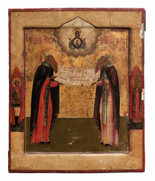 Icône : Résurrection et Descente aux limbes entourées des grandes fêtes de l'Eglise orthodoxe : la Naissance de la Vierge, la Présentation de la Vierge au temple, l’Annonciation, la Nativité, la Présentation du Christ au temple, le Baptême du Christ, l’Entrée à Jérusalem, la Transfiguration, l'Ascension, la Trinité de l'Ancien Testament, l’Exaltation de la Croix, la Dormition de la Vierge. Dans les coins de l'icône sont représentés les quatre évangélistes.