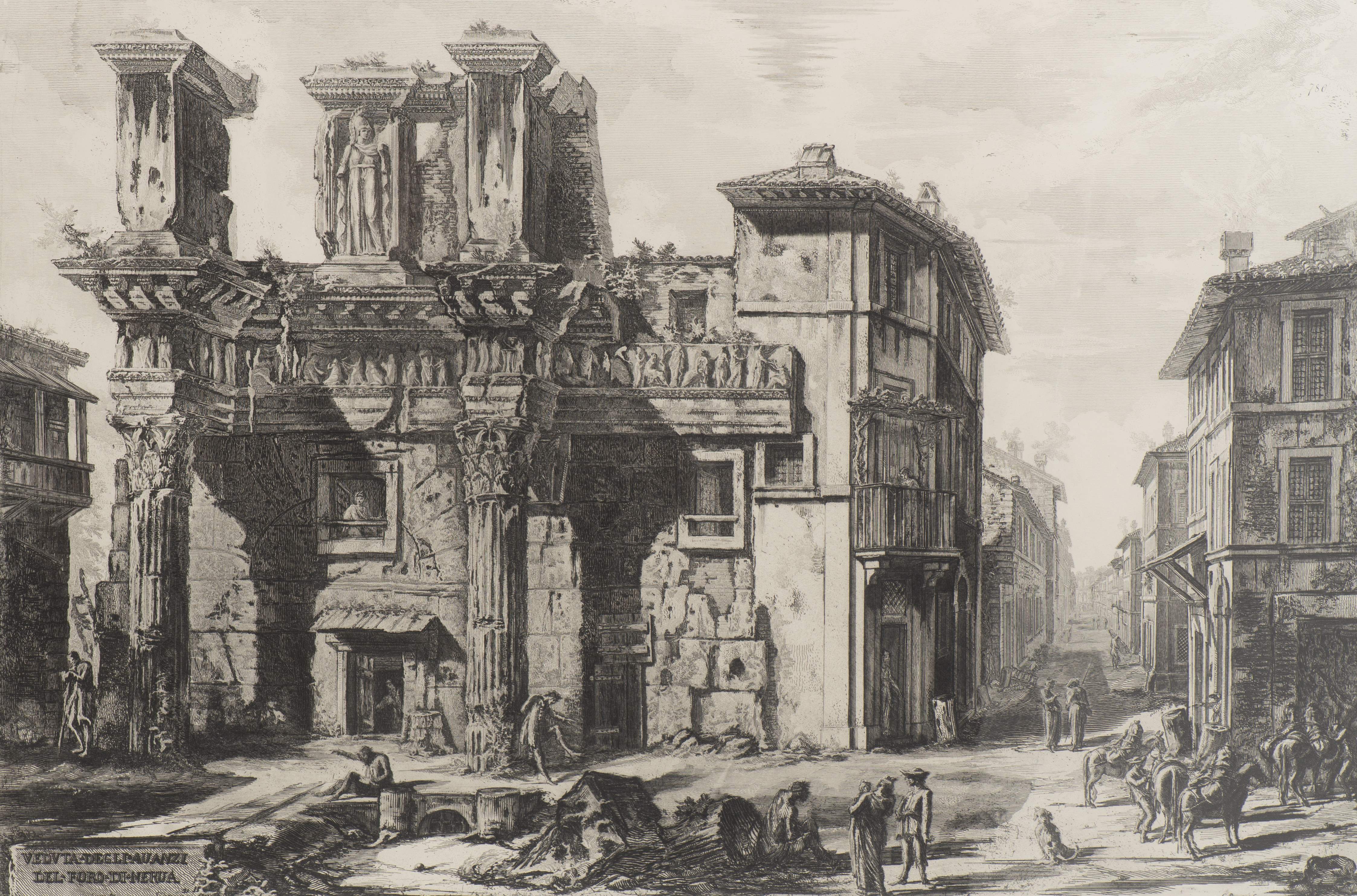 Giovanni Battista PIRANESI (1720-1778) (d'après) , "Vue de Rome : Forum de Nerva", calcographie sur papier, sbd dans la plaque. Tampon en bas à droite "Calcografia".