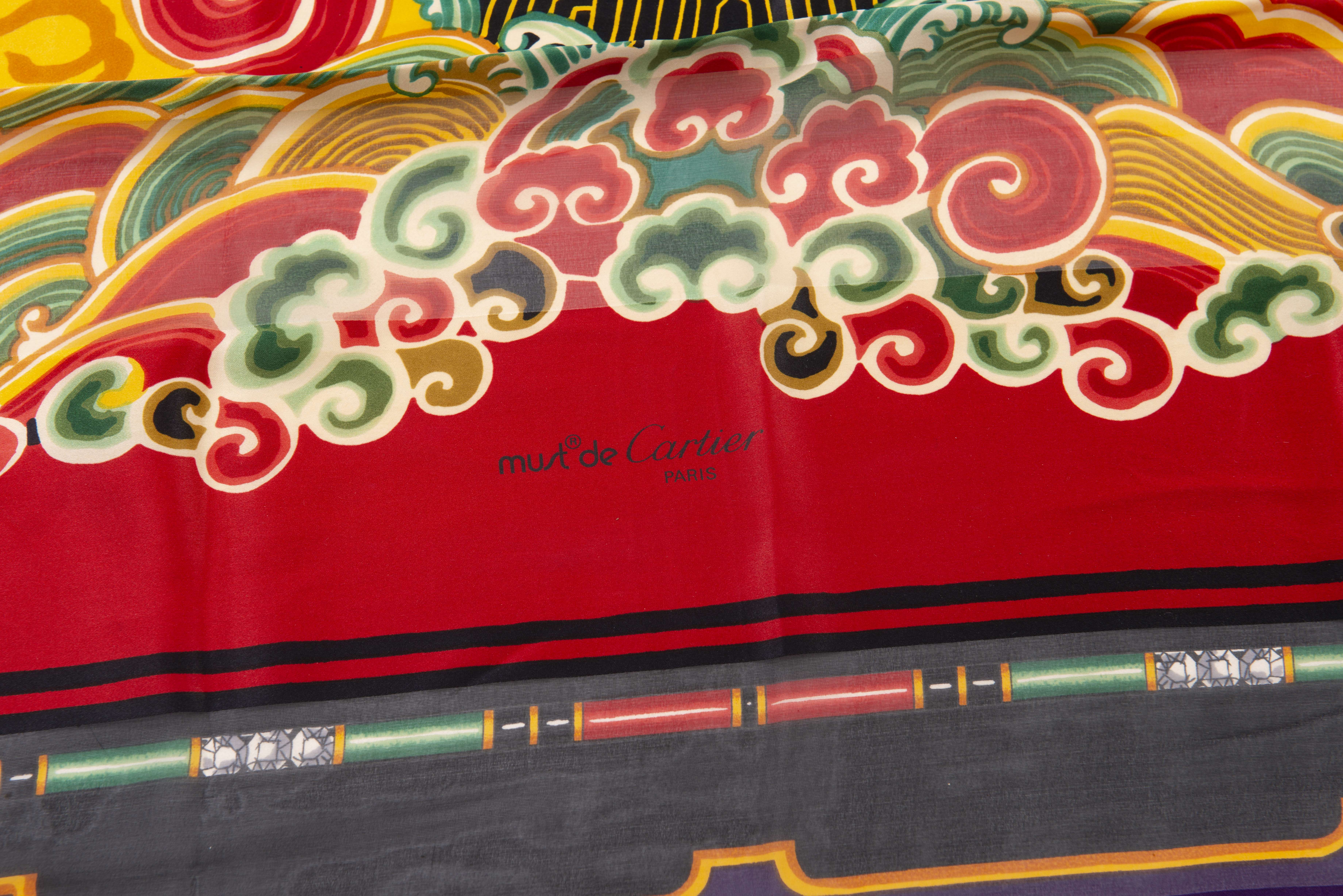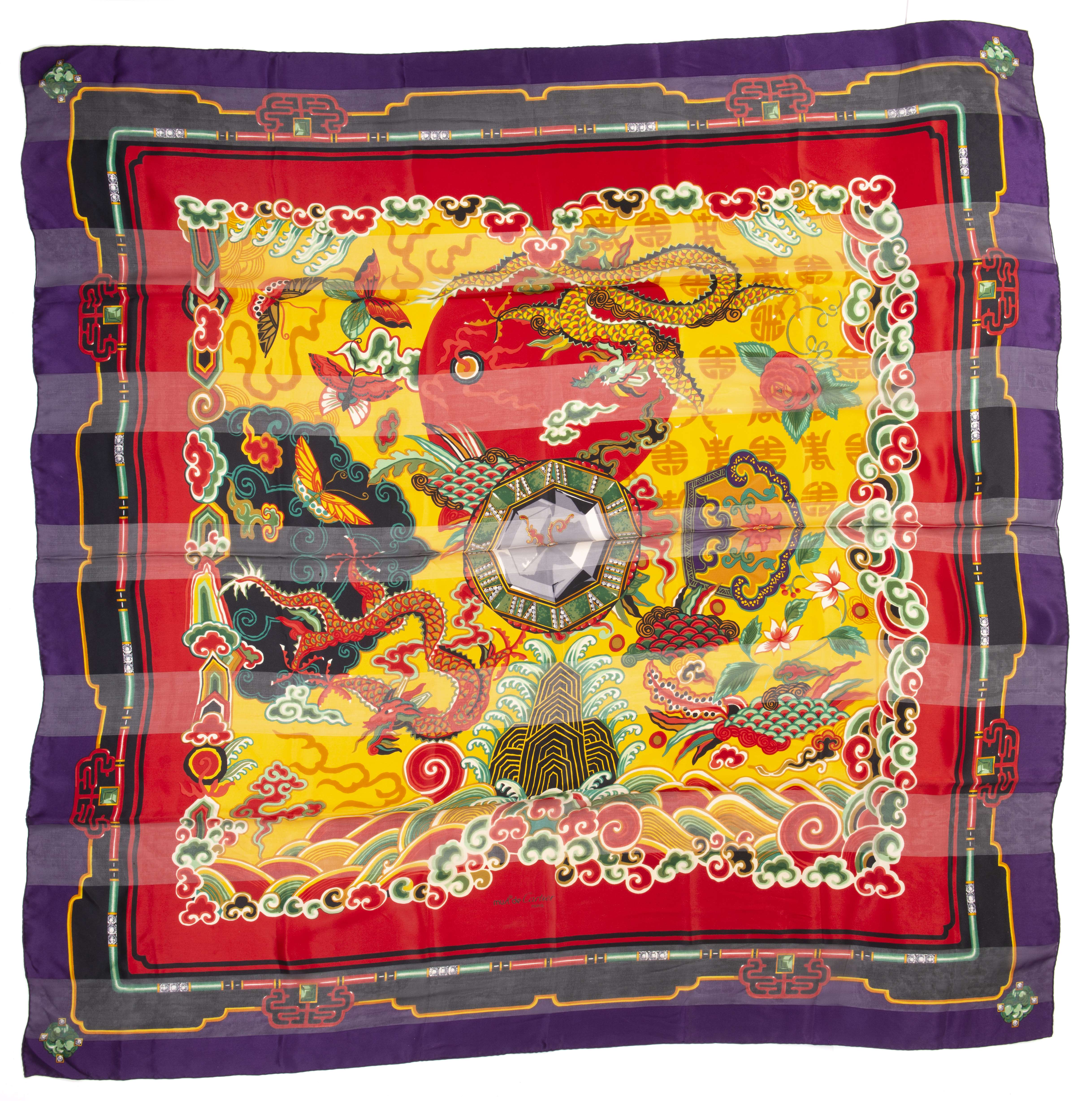 Must de CARTIER Paris, carré en mousseline de soie, motifs chinois sur fond violet.