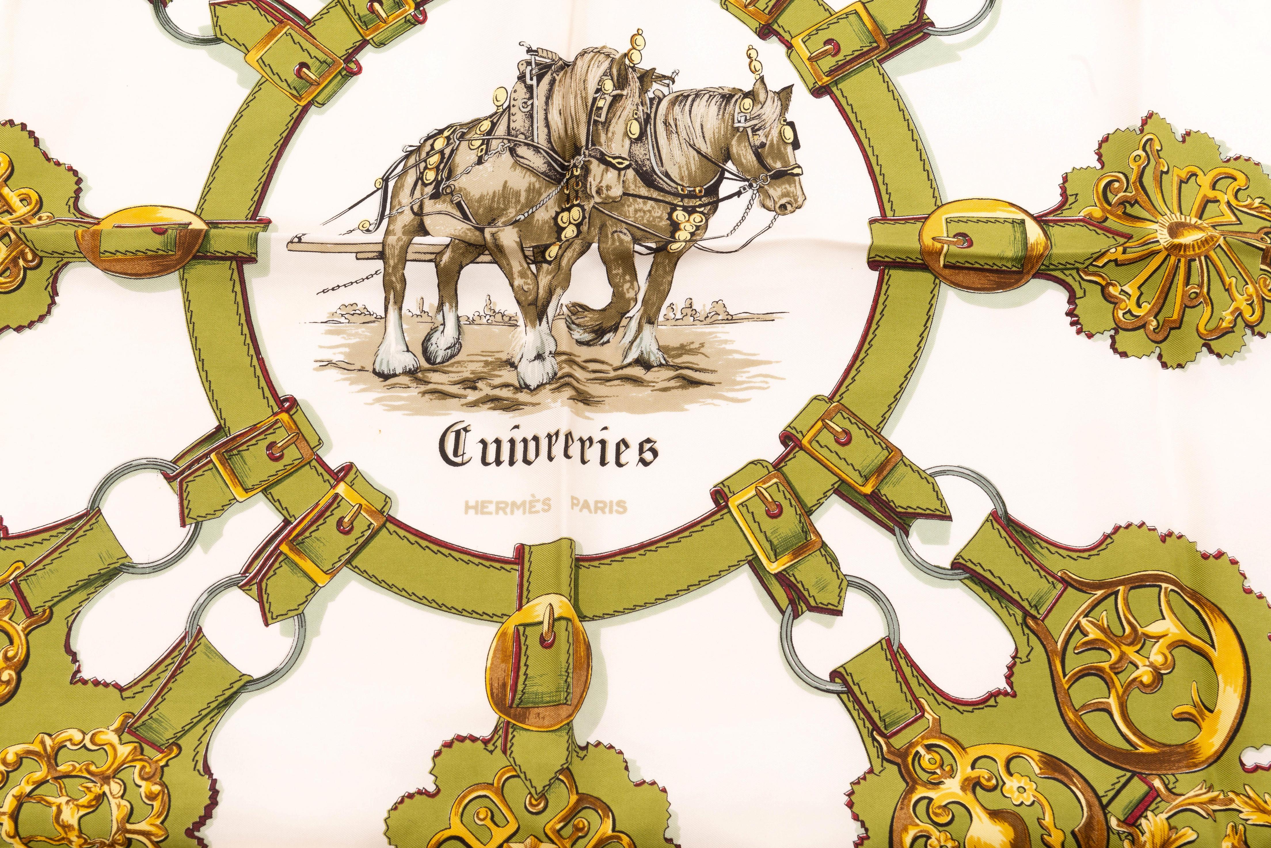 Hermès Paris, carré en twill de soie "Cuivreries" par Françoise de la Perrière à bordure bordeaux