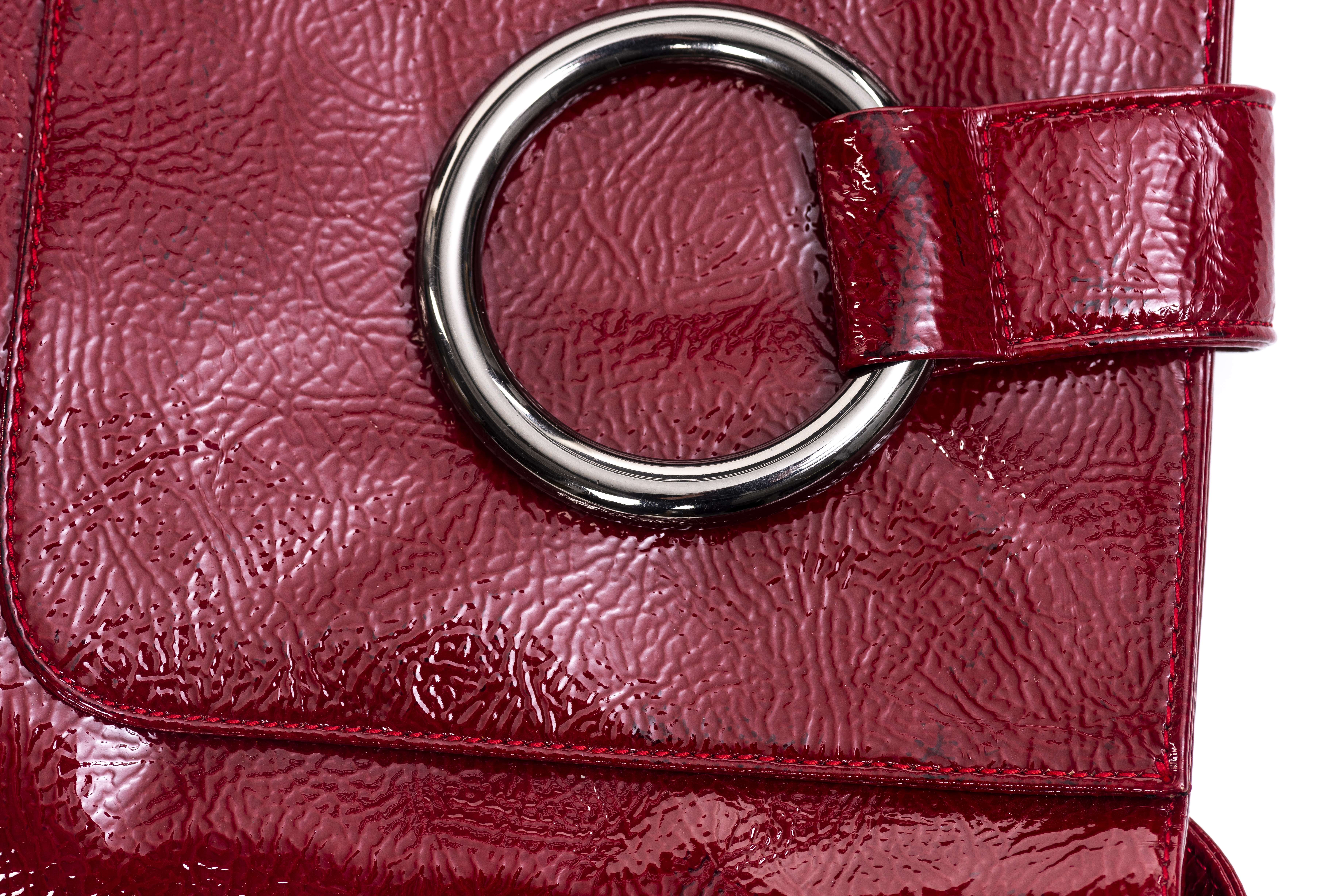 Sequoia Paris, deux sacs Trotteur carrés en toile enduite brillante texturée, l'un rouge et l'autre noir, à bandoulière et fermeture à rabat retenant un large anneau métallique, ligne Nova.