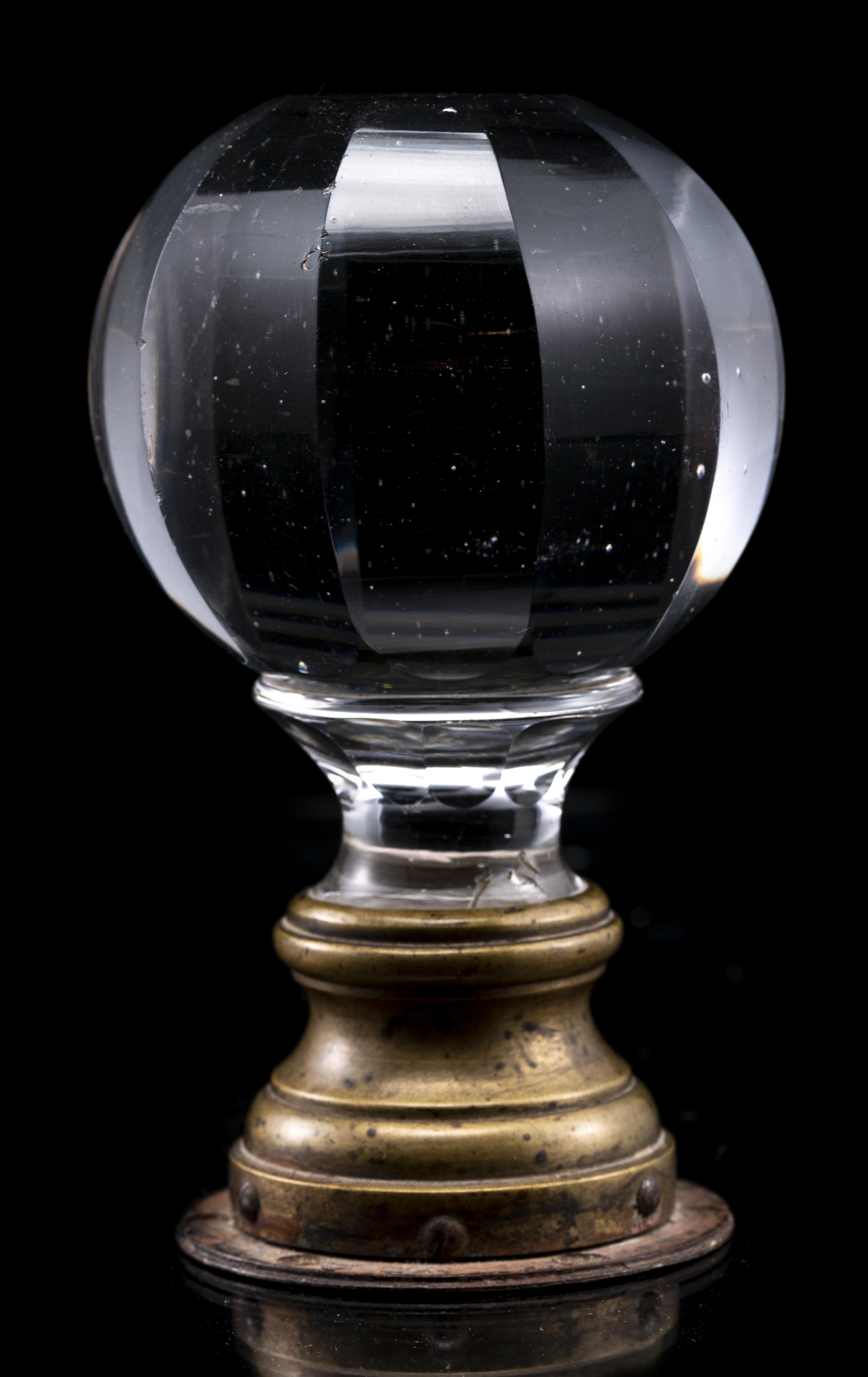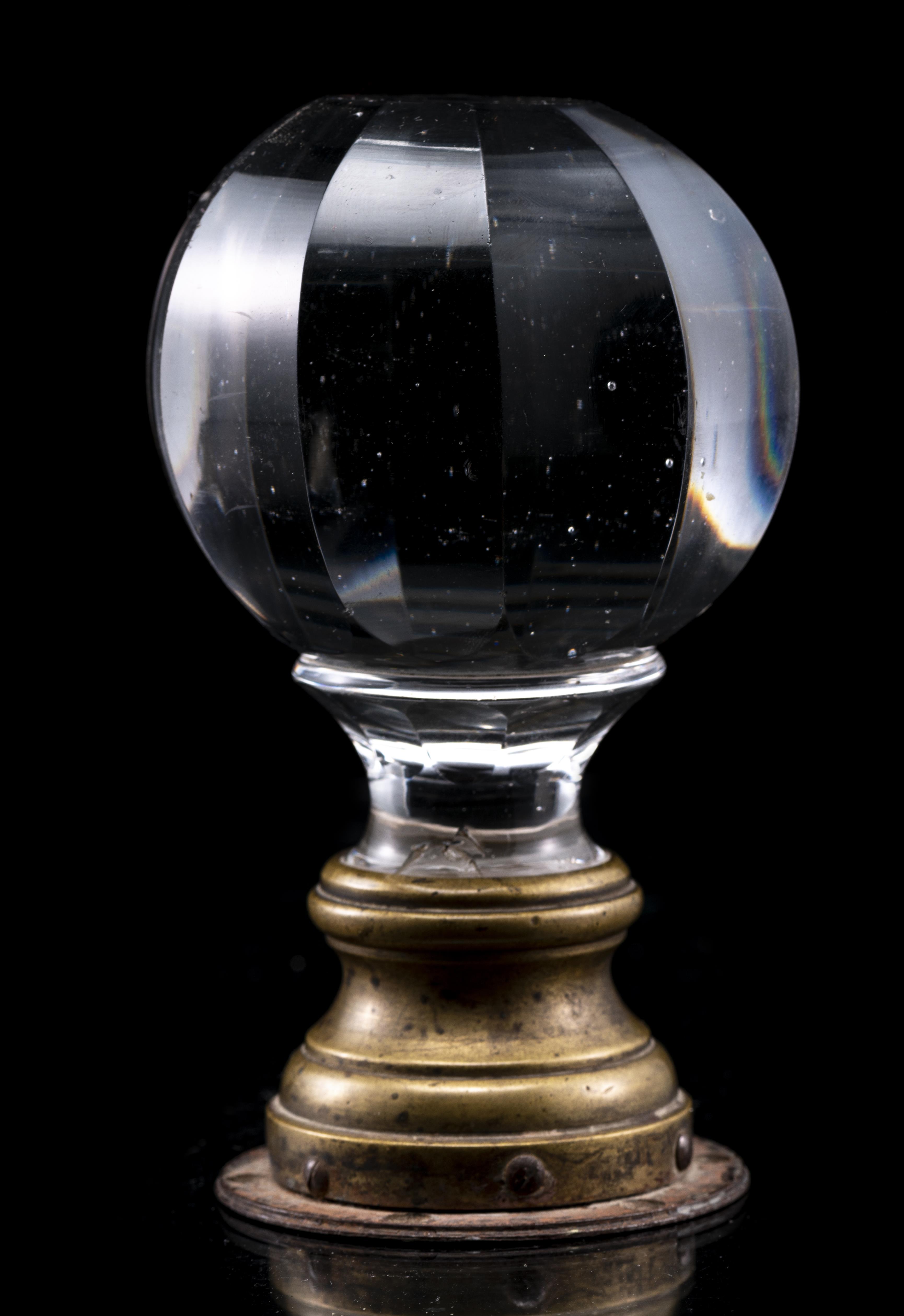 Boule de rampe d'escalier en cristal fumé monté sur une base en bronze.
