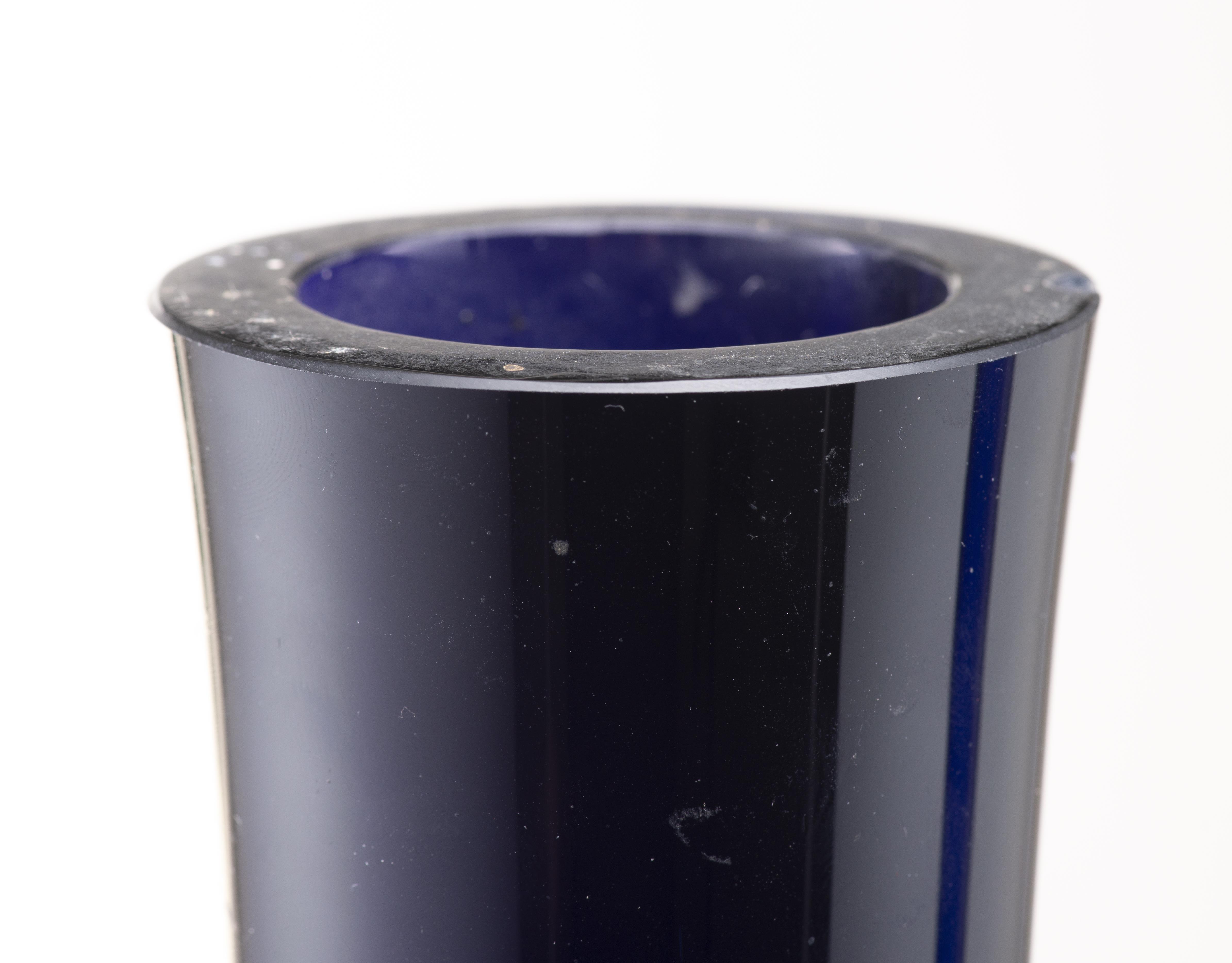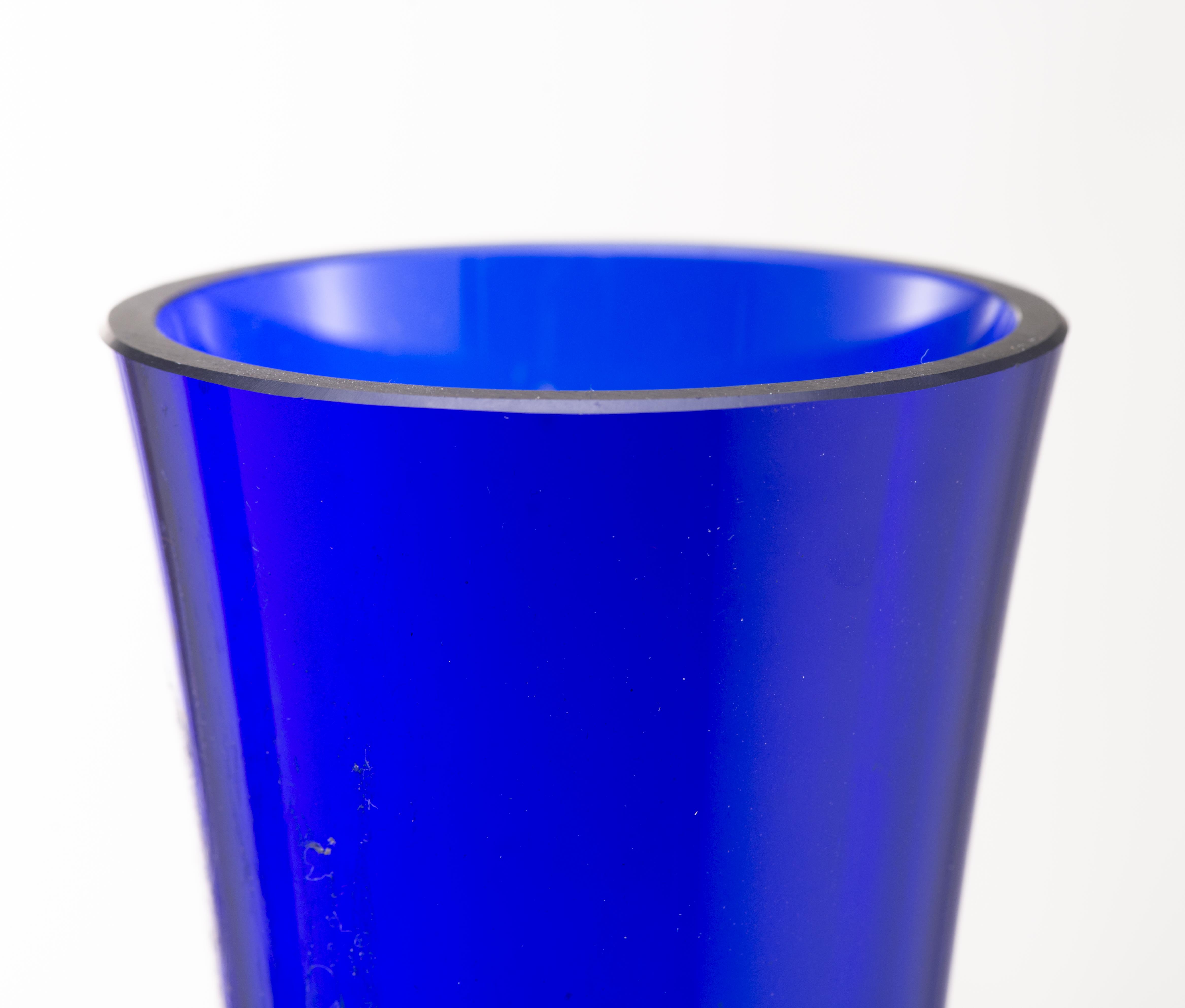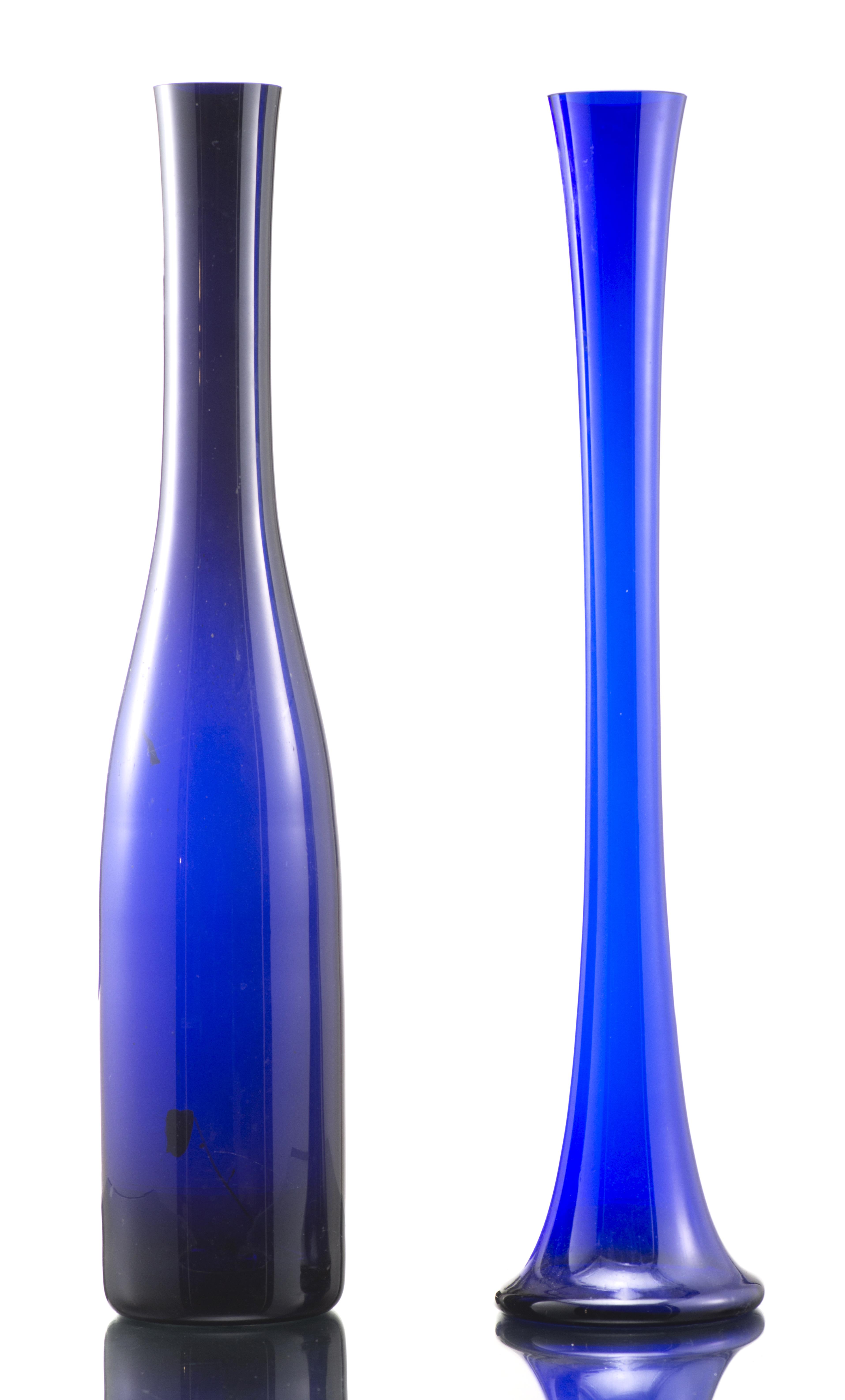 Deux longs vases soliflores en verre bleu non signés