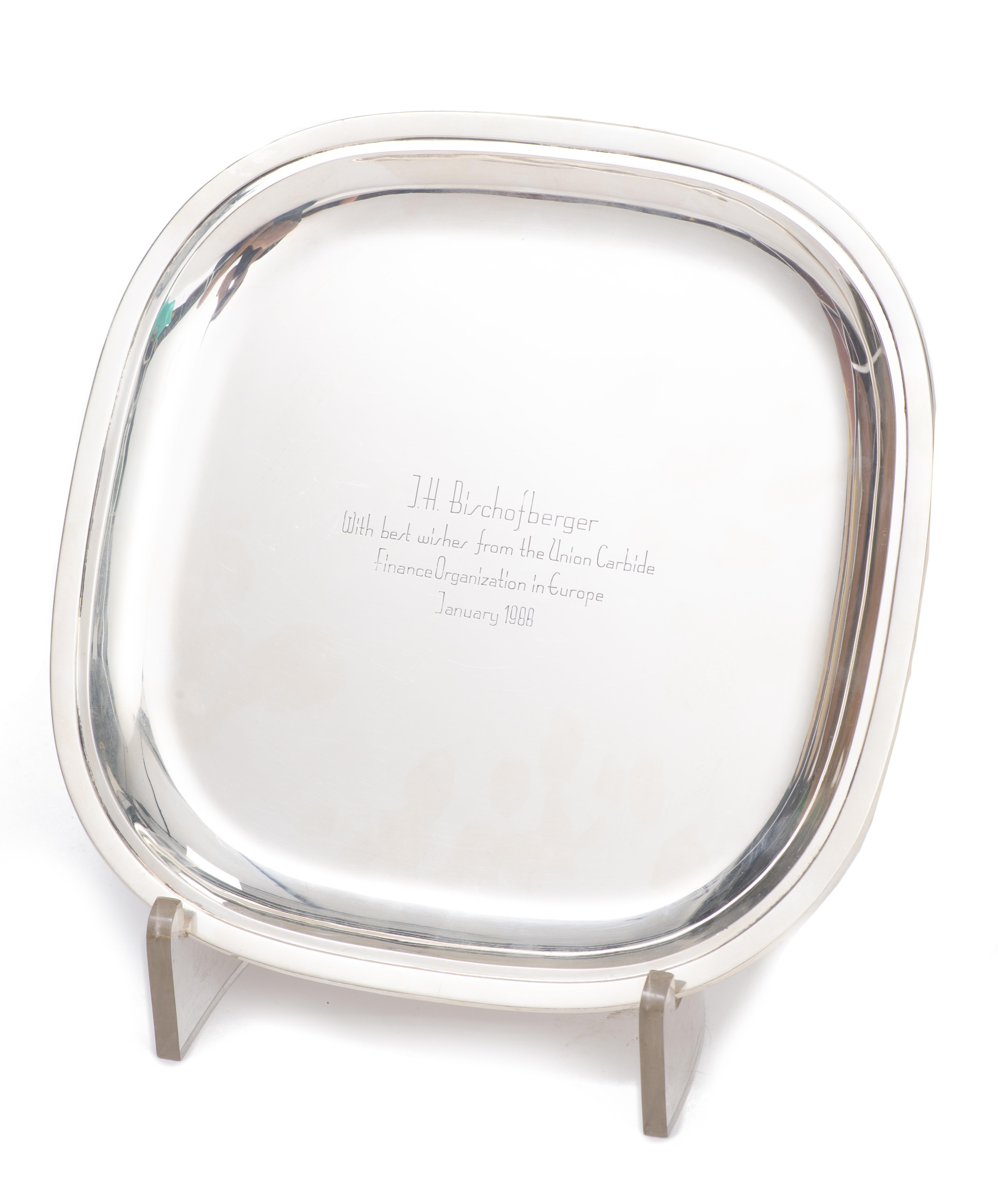 Plateau en argent .800 Jezler, bords arrondis, dédicace au centre.