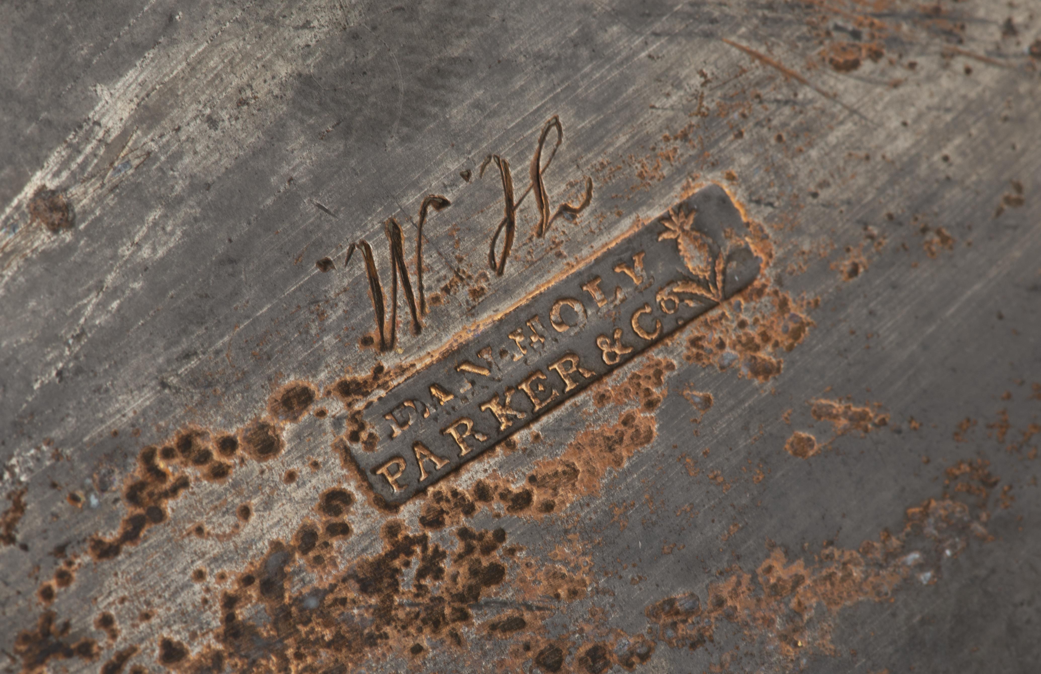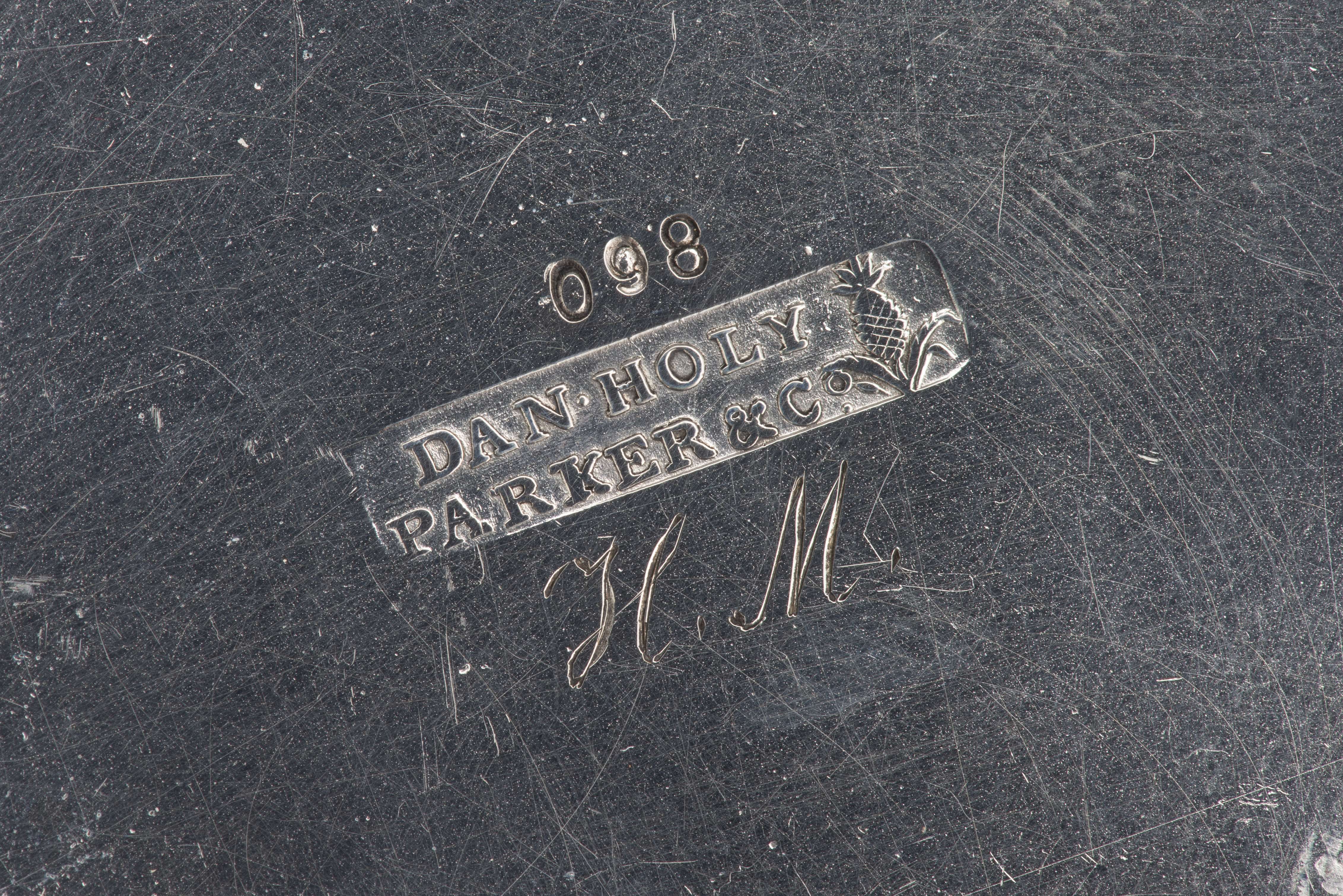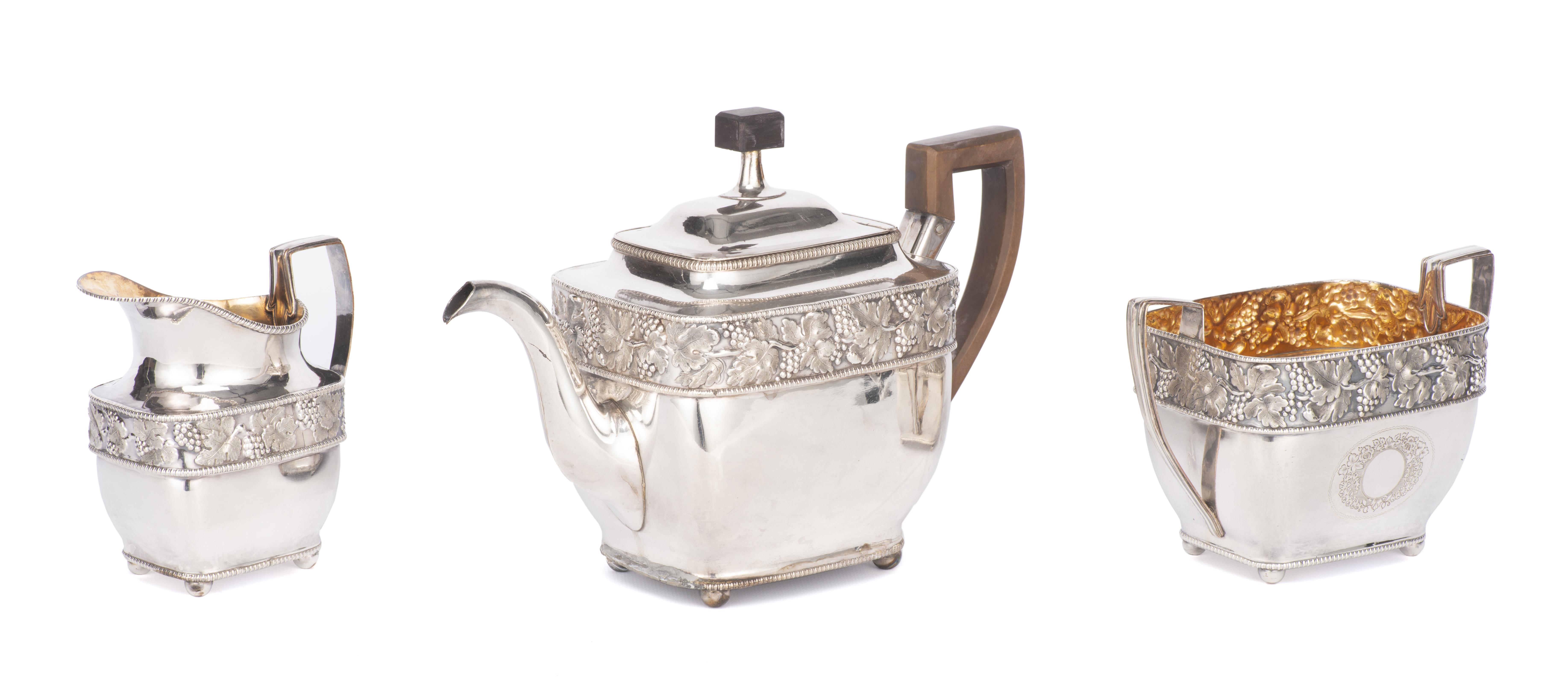 Service à thé en métal argenté et métal doré par Dan. Holy Parker & C° à frise à décor de grappes de raisin comprenant une théière, un pot à lait et un sucrier de forme rectangulaire.