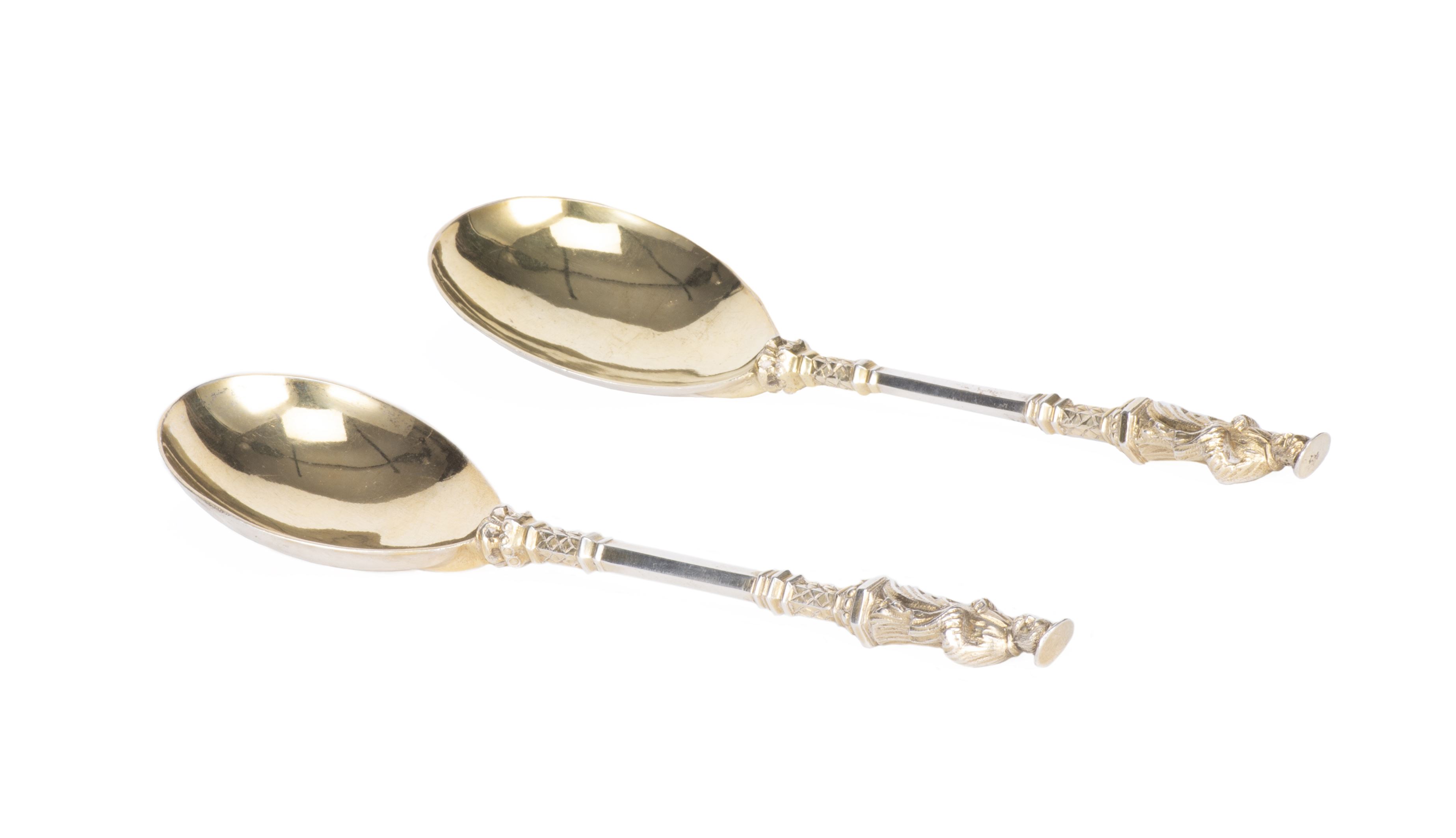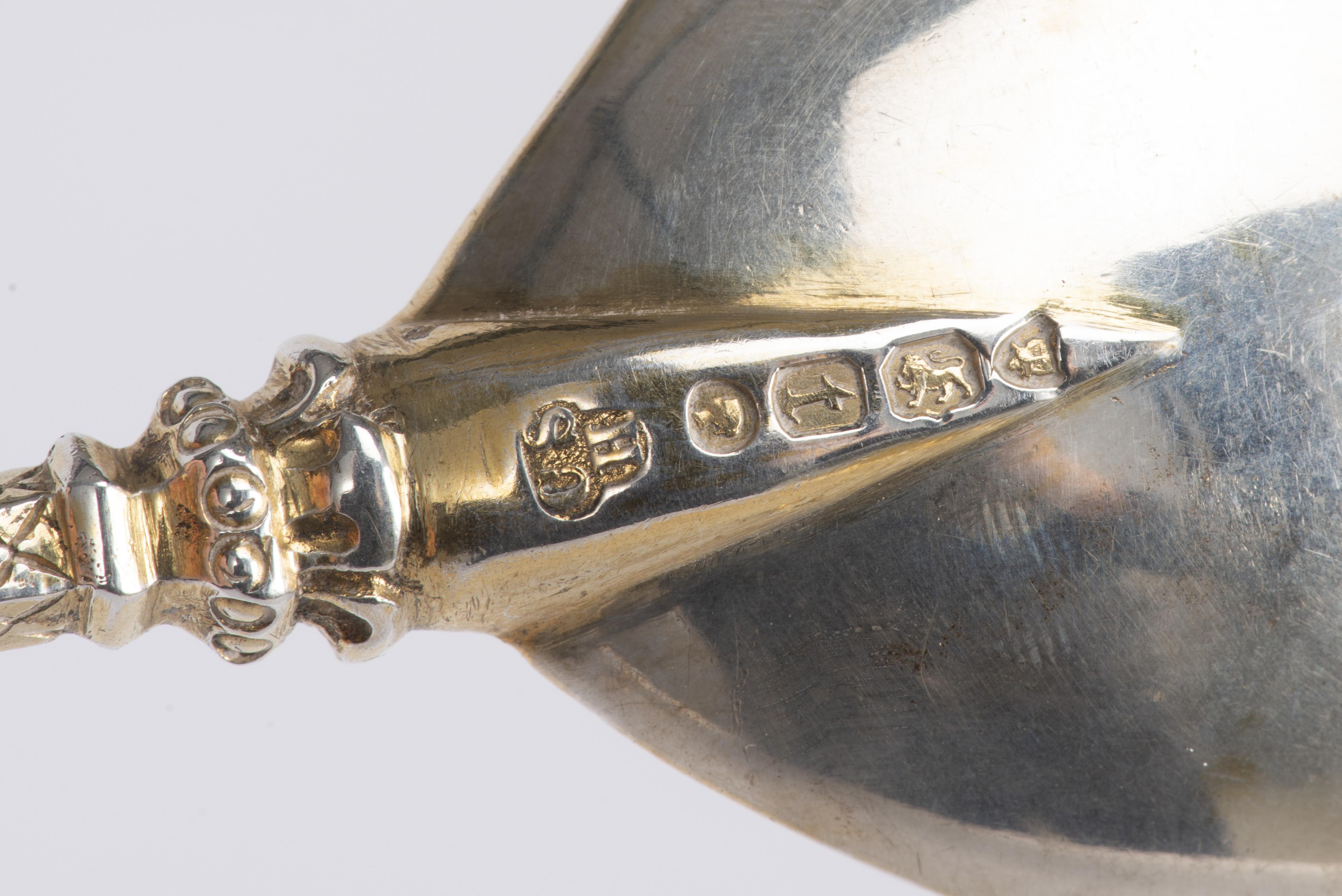 Deux cuillères à crème en argent sterling .925 anglais de Londres de 1874 par C.S. Harris de style néogothique et de style victorien avec cuilleron en vermeil, manches partiellement en vermeil surmontés d'un saint.