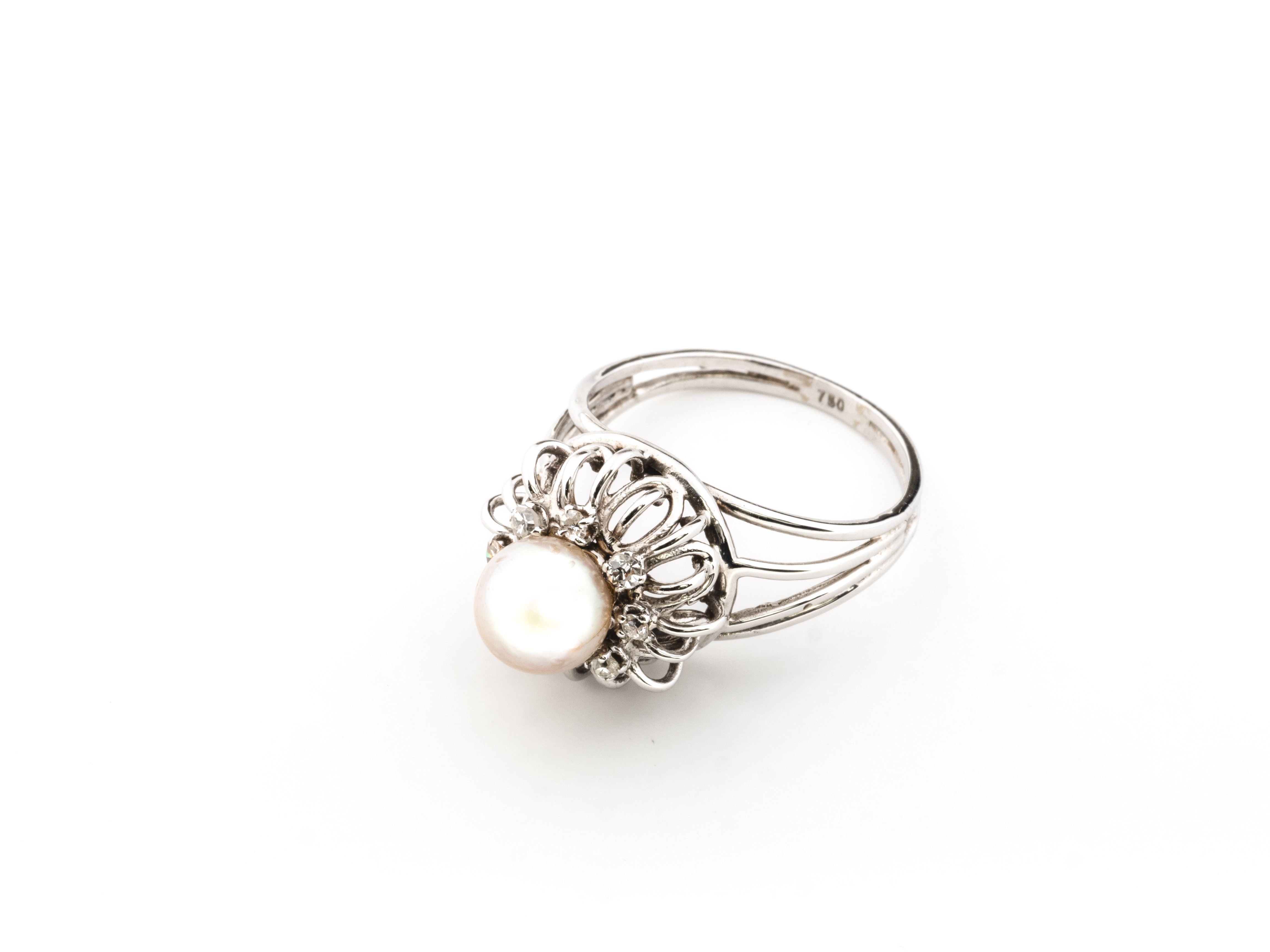 Bague perle en or gris .750 avec une perle centrale Diam … et 8 diamants de taille brillant pour un total de …