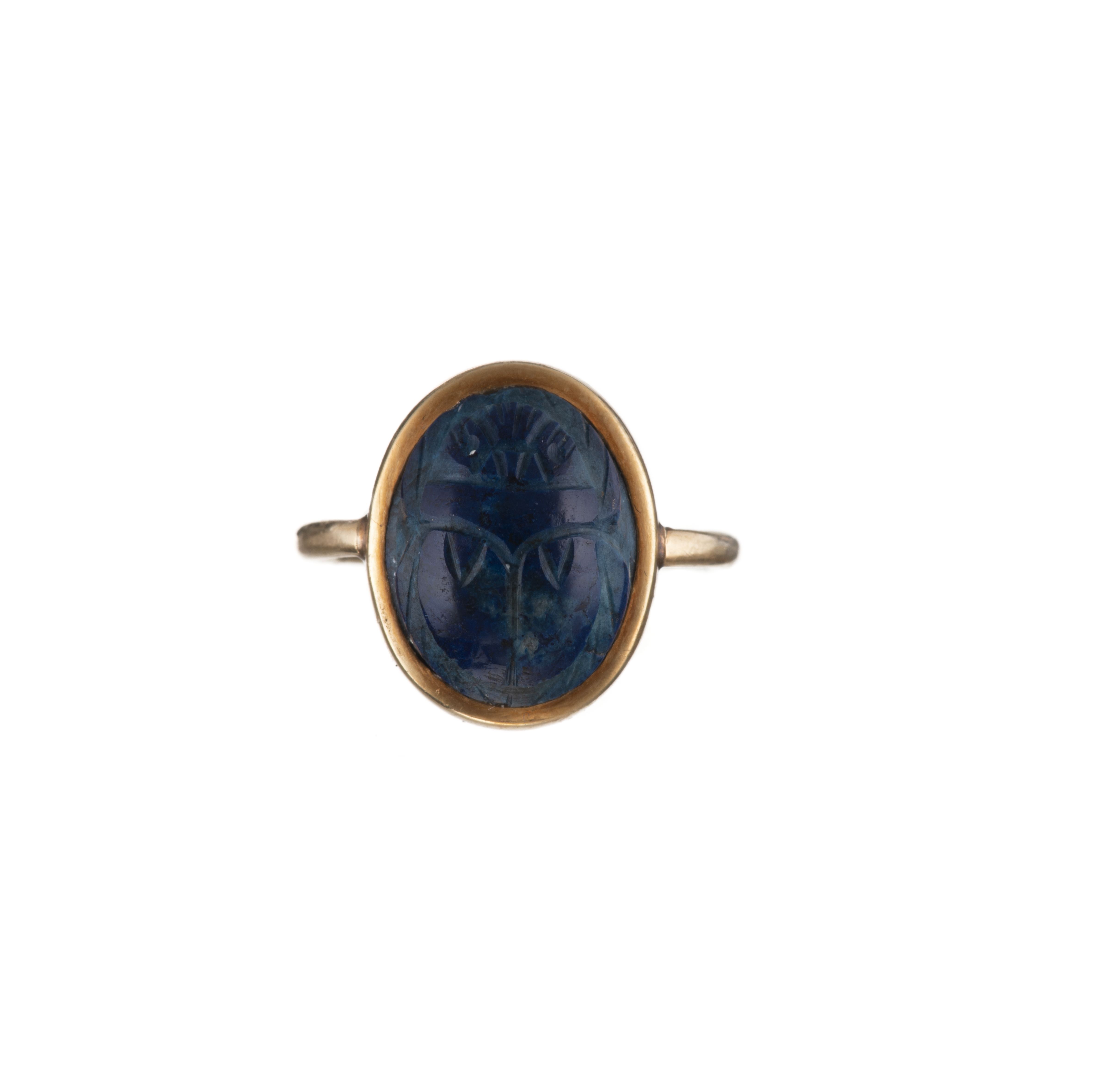 Bague en or jaune .750 avec un lapis lazzuli cabochon ovale serti clos gravé en forme de scarabée.