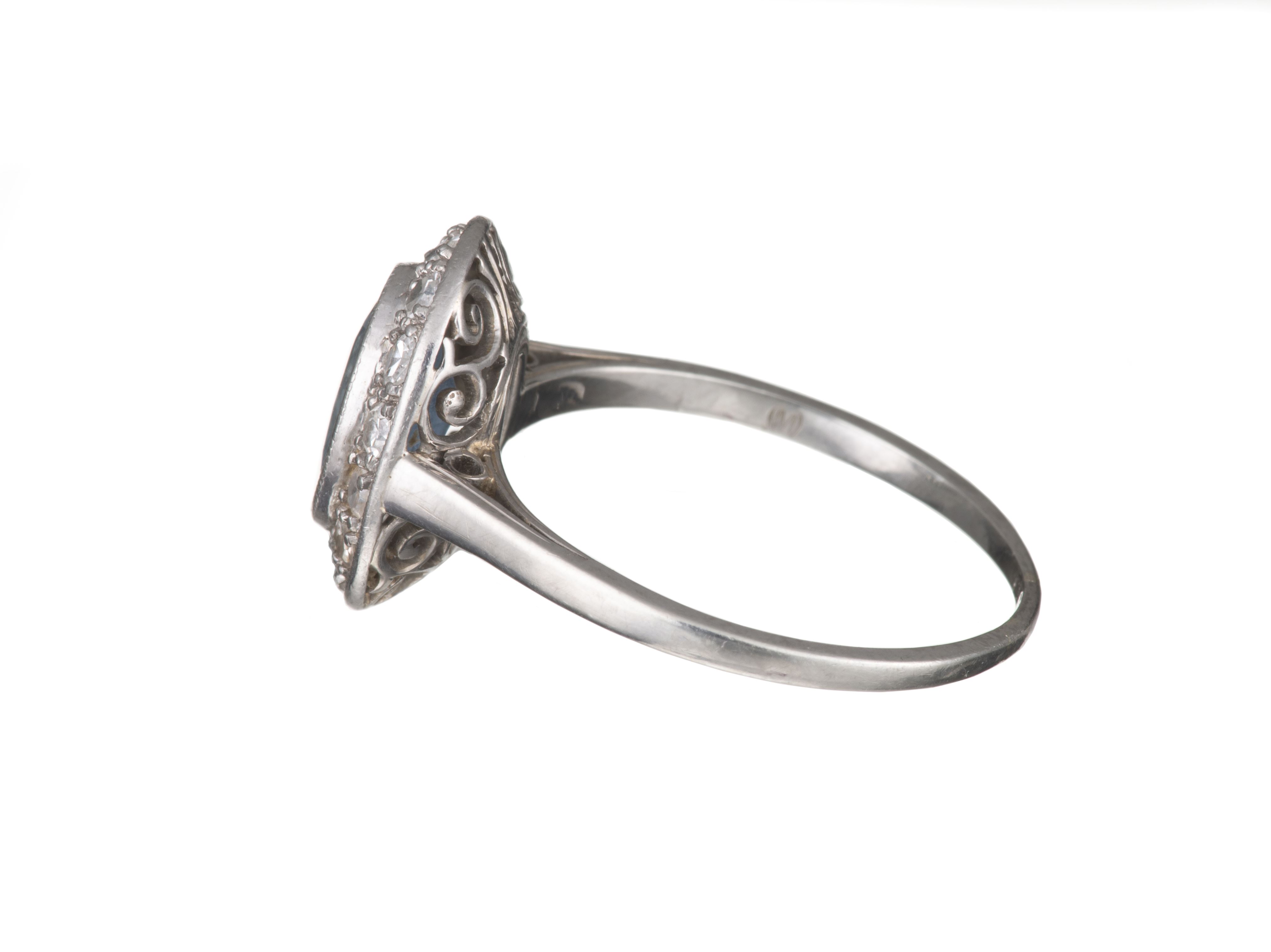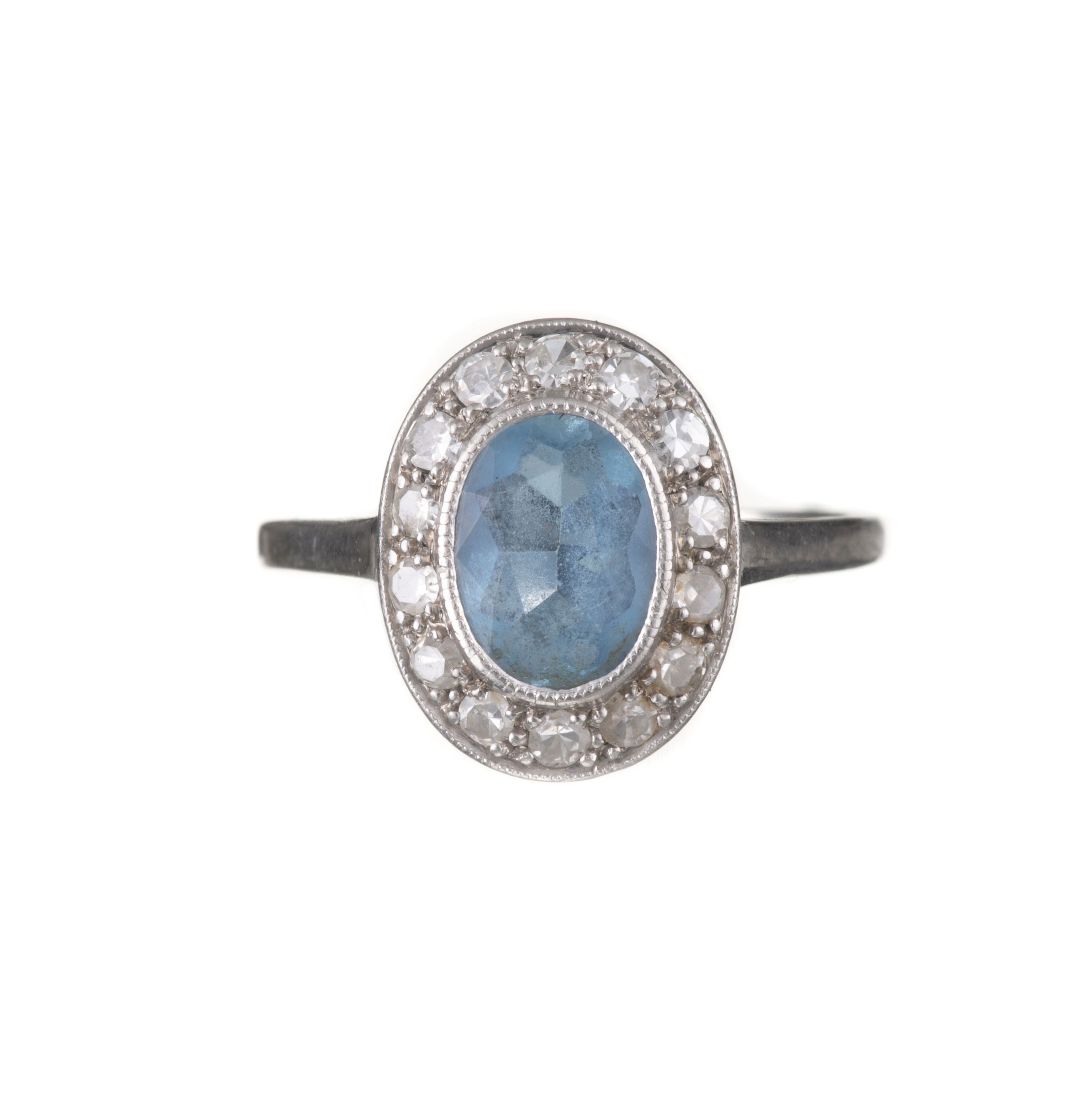 Bague en or gris .750 avec une aigue-marine de forme ovale de env. 1 ct entourée de 14 diamants de taille 8/8.