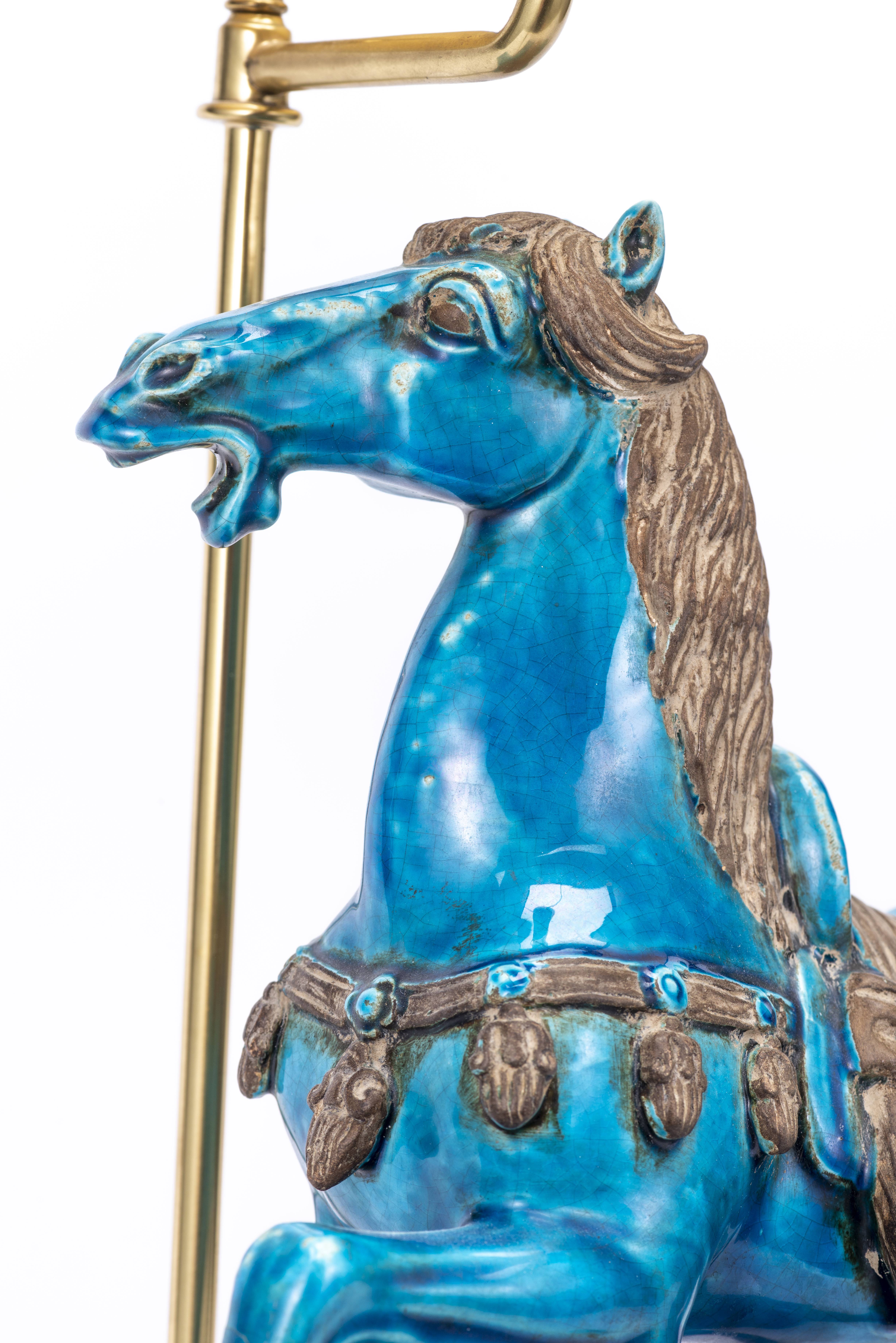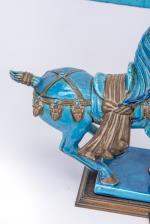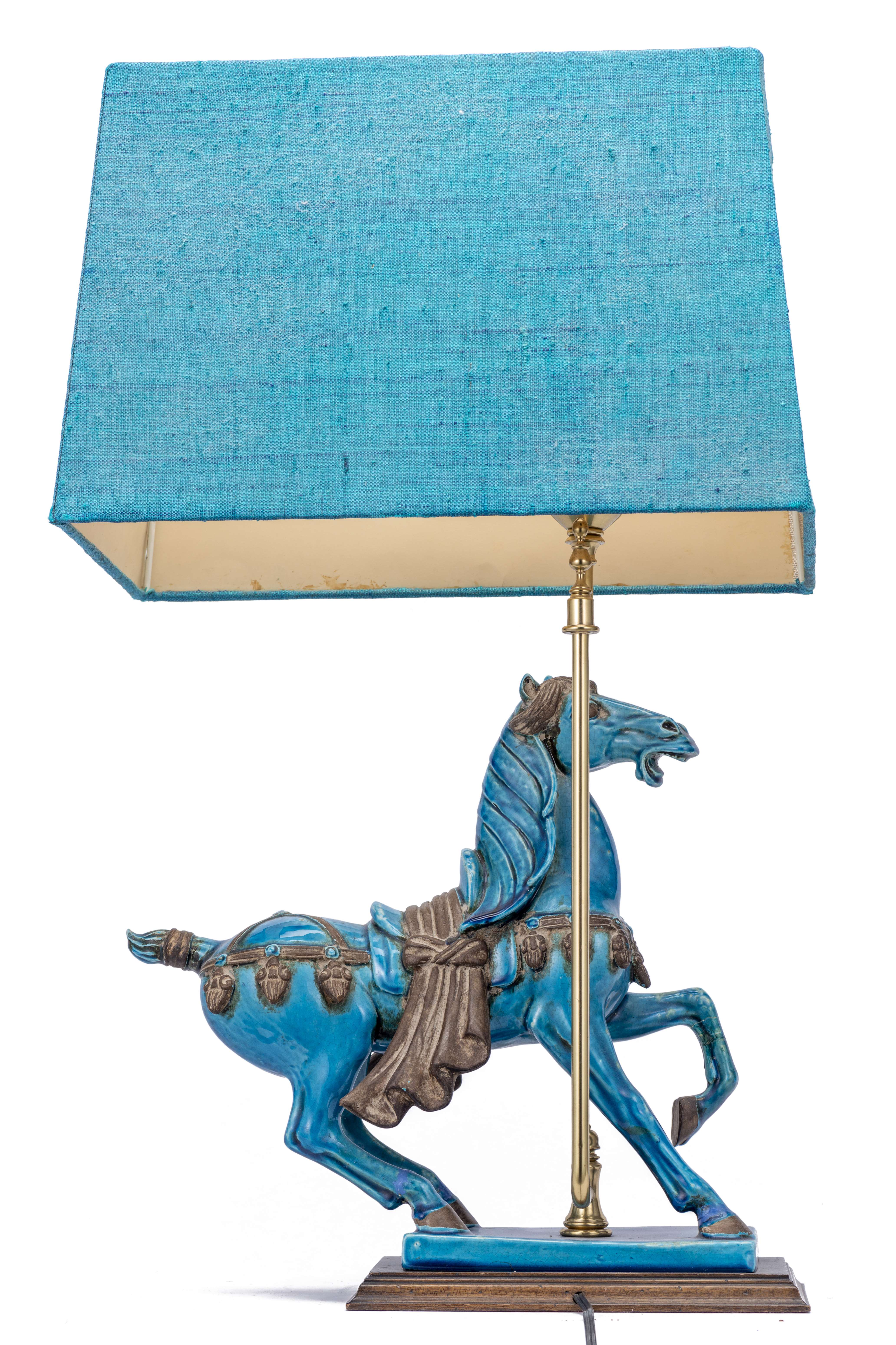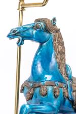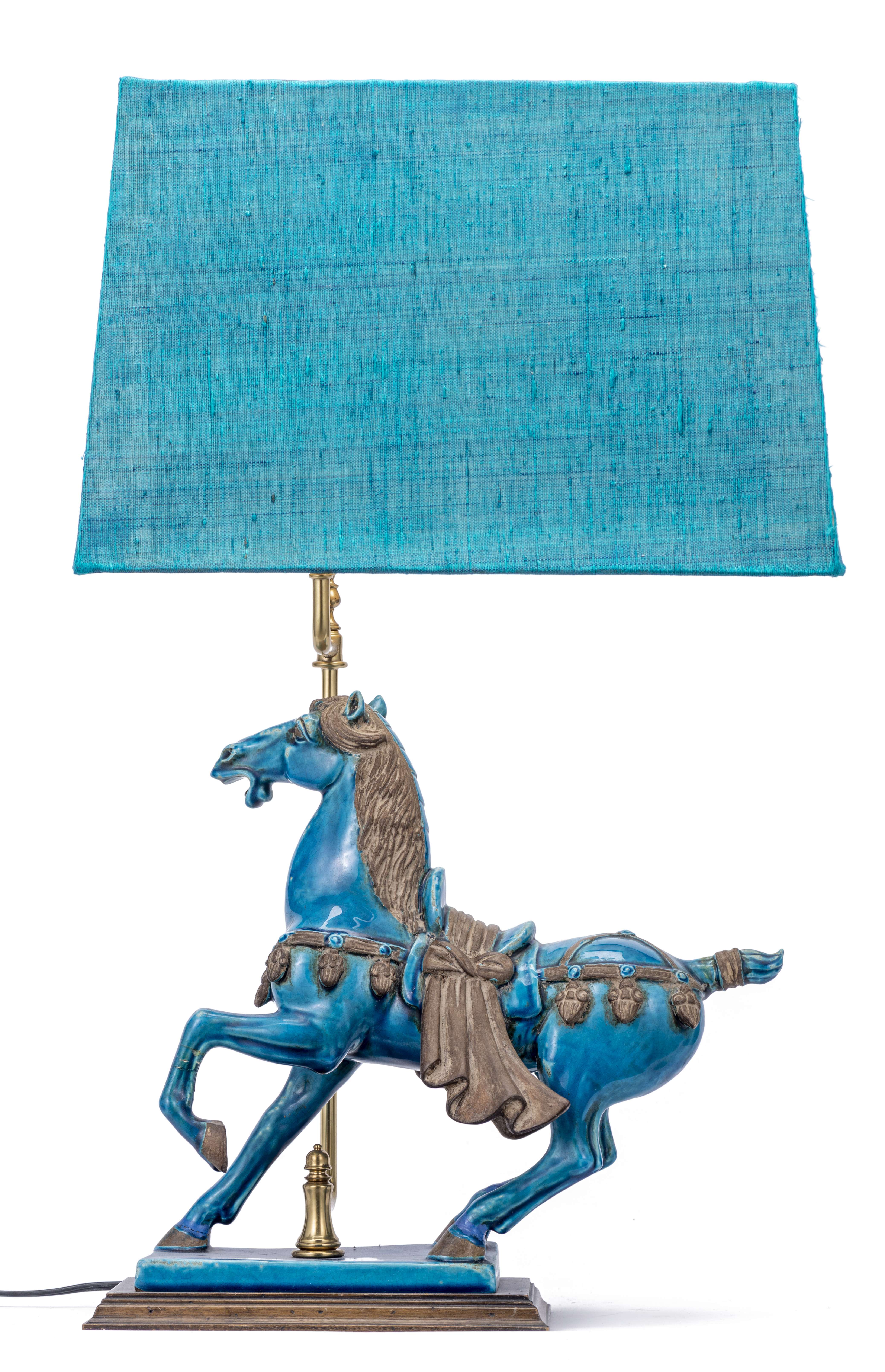 - pour l'autre, une base en forme d'un cheval de style Tang à glaçure turquoise et abat-jour rectangulaire.