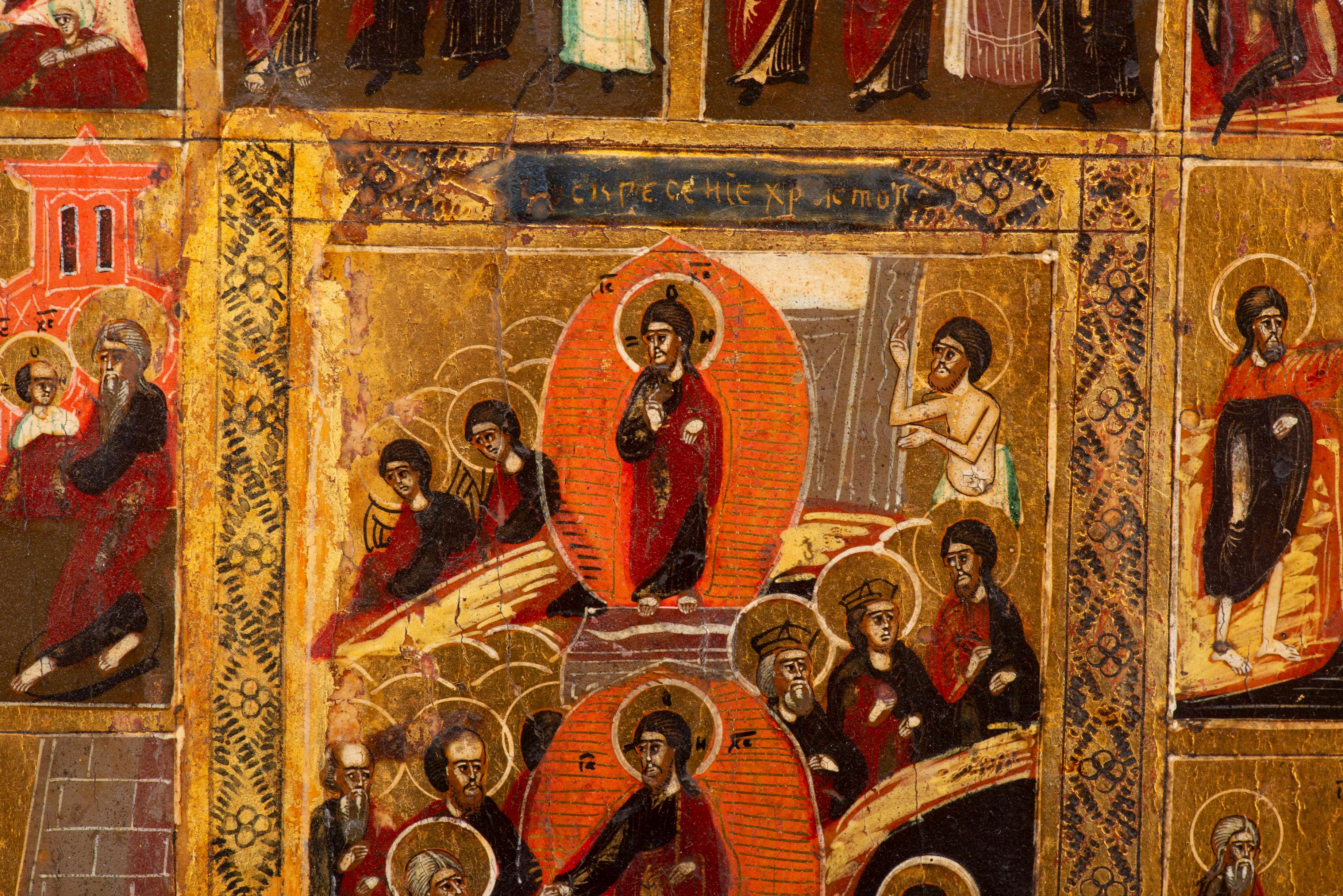 Au centre: la délivrance (le Christ dans les limbes), entouré de: la naissance de la Mère de Dieu, la Présentation de Marie au temple, l'Annonciation, La naissance de Jésus-Christ, Représentation du Christ, Baptême du Christ dans le Jourdain, Entrée du Christ en Jérusalem, Sublimation du Christ sur le Mont Tabor, Ascension, Sainte Trinité (version de l'Ancien Testament, trois anges à table servis par Abraham et Sara), élévation de croix, Mort de Marie sur fond doré. Pourtour de la scène centrale au poinçon.